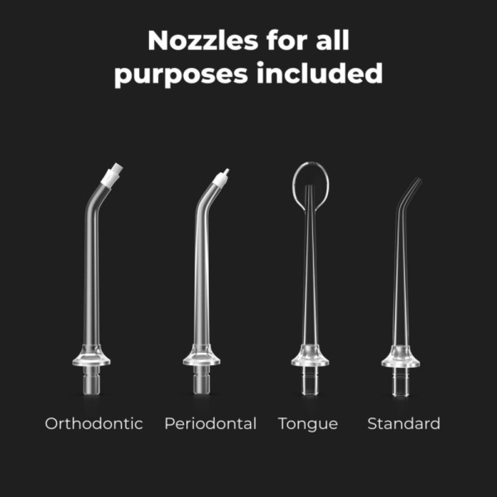 До комплекту входять насадки для всіх цілей: ортодонтична, пародонтологічна, насадка для чищення язика, стандартна