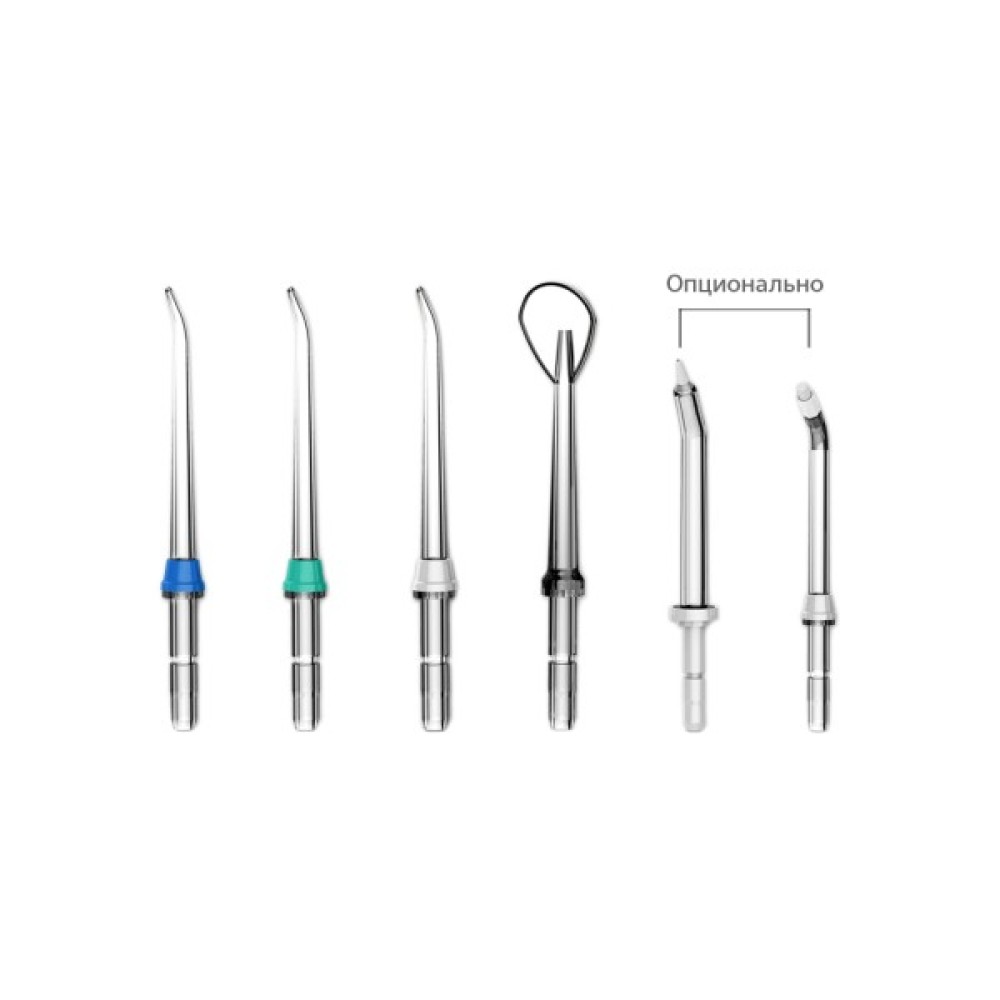 • Багатофункціональна ручка: при натисканні на кнопку насадка легко знімається та одягається; насадка обертається на 360° для легкого доступу до будь-якої ділянки ротової порожнини; перемикач Увімк/Вимк дозволяє легко призупиняти подачу води.