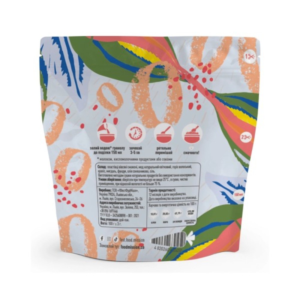 Гранола горіхова Food Mission - це смачний та поживний продукт, ідеальний для швидкого та корисного сніданку або перекусу. До її складу входять натуральні інгредієнти: вівсяні пластівці, різноманітні горіхи (мигдаль, кеш'ю, фундук), насіння льону, мед та сухофрукти (родзинки, курага), що забезпечує гармонійне поєднання смаків та текстур. Продукт не містить доданого цукру та консервантів, тому підходить для людей, які дбають про своє здоров'я.