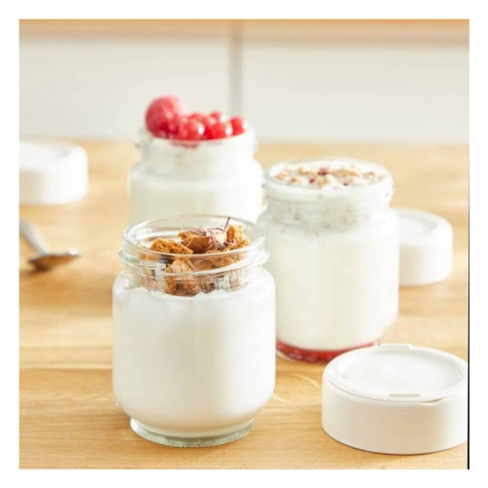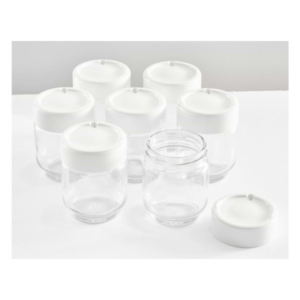 Повний набір, що містить 7 міцних скляних банок для йогурту (160 мл) з кришками, які можна мити в посудомийній машині.