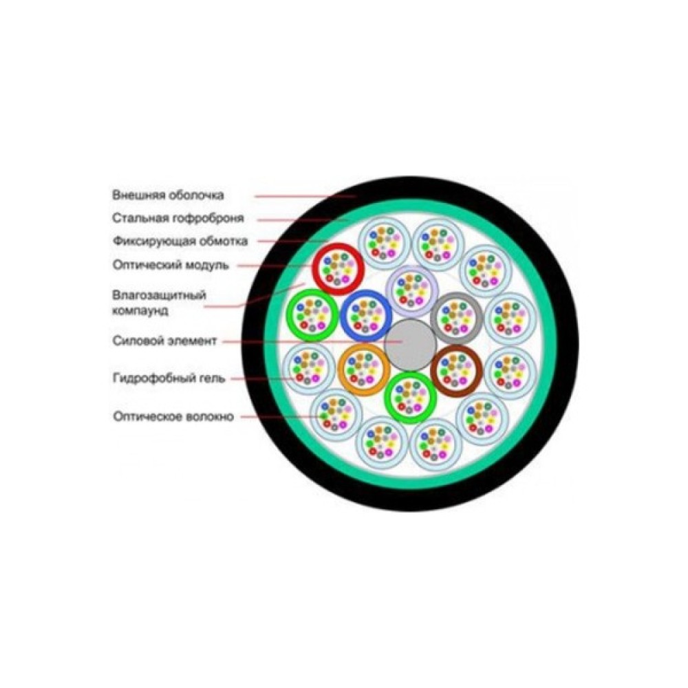Усередині модулів знаходиться гідрофобний гель. У кабелі з малою кількістю волокон, замість відсутніх оптичних модулів застосовуються т.зв. «заповнюючі» модулі. Простір між модулями заповнений водоблокуючим компанундом. Поверх сердечника кабелю накладена броня з сталевої гофрованої стрічки, яка, крім механічного захисту, служить гідробар’єром, що перешкоджає дифузії вологи через полімерні оболонки в сторону оптичного волокна. Зовнішня оболонка виготовлена з УФ-стабілізованого поліетилену високої щільності.
