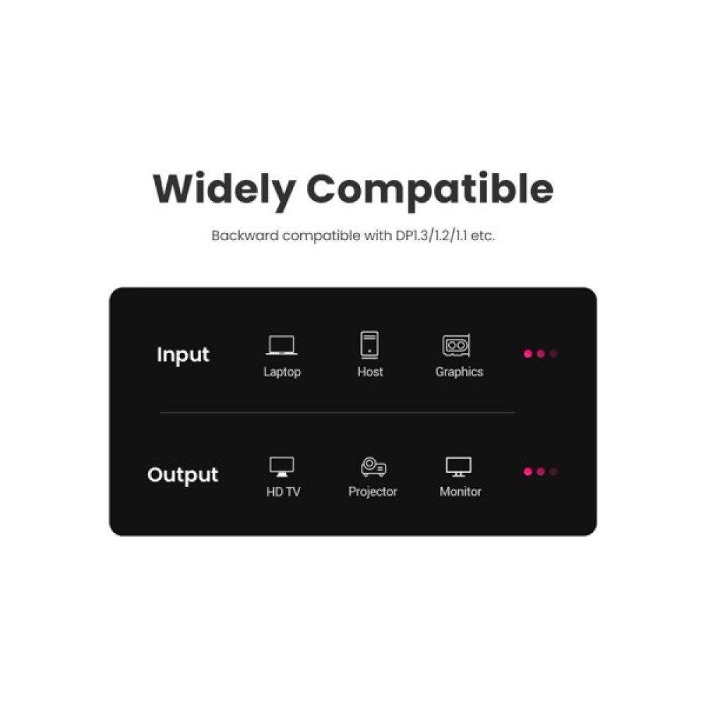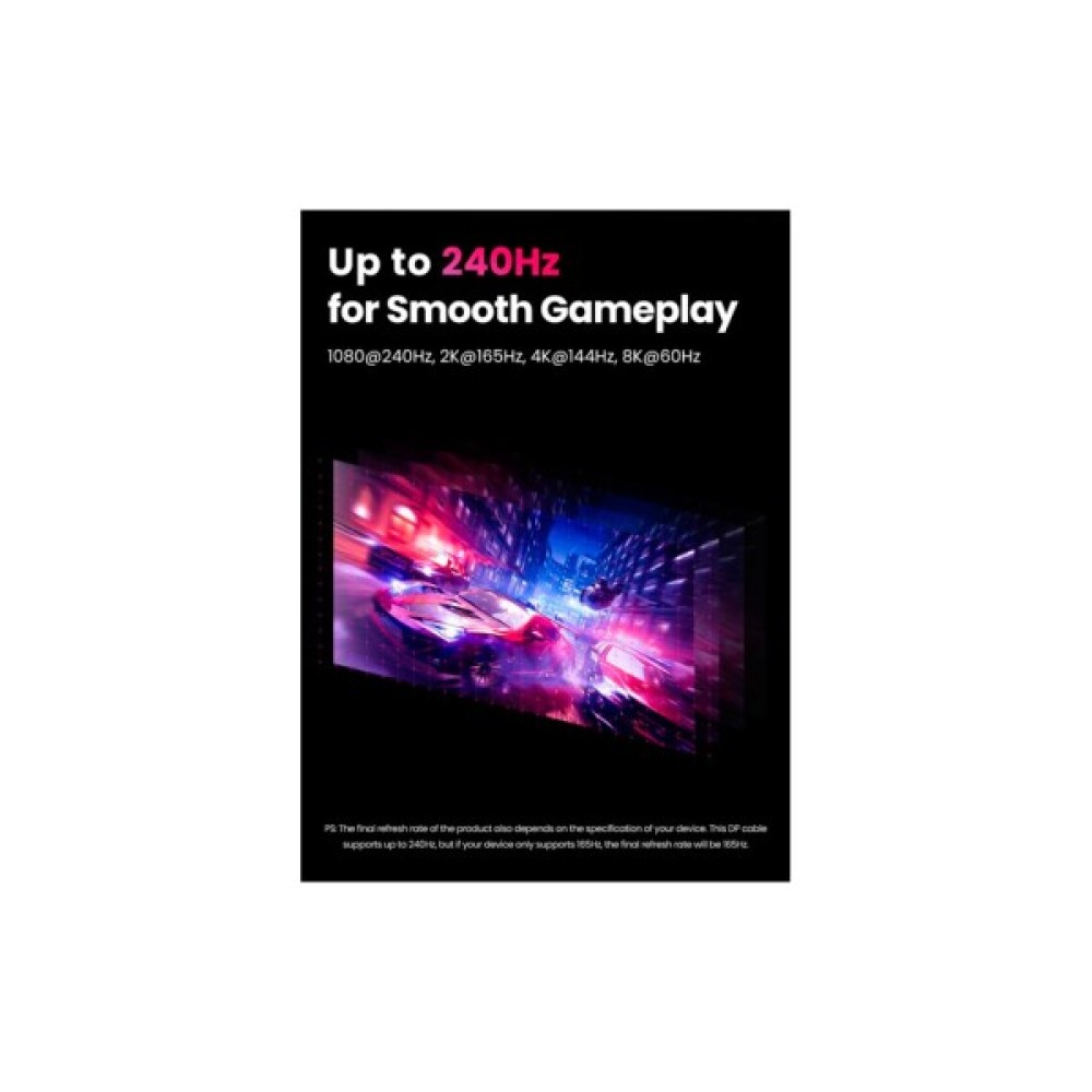 Кабель DisplayPort не тільки підтримує 3D-відео, але також може підтримувати роздільну здатність до 8K 7680x4320 при 60 Гц, 4K 3840x2160 при 144 Гц і 2K при 165 Гц, що ідеально підходить для високопродуктивних ігор або перегляду HD-. Це оптимальний вибір для великих ігор, домашнього кінотеатру та екранної реклами. DisplayPort 1.4 може передавати дані із пропускною здатністю до 32,4 ГБ/с. Переконайтеся, що відеокарта та монітор підтримують вищу роздільну здатність та частоту оновлення.