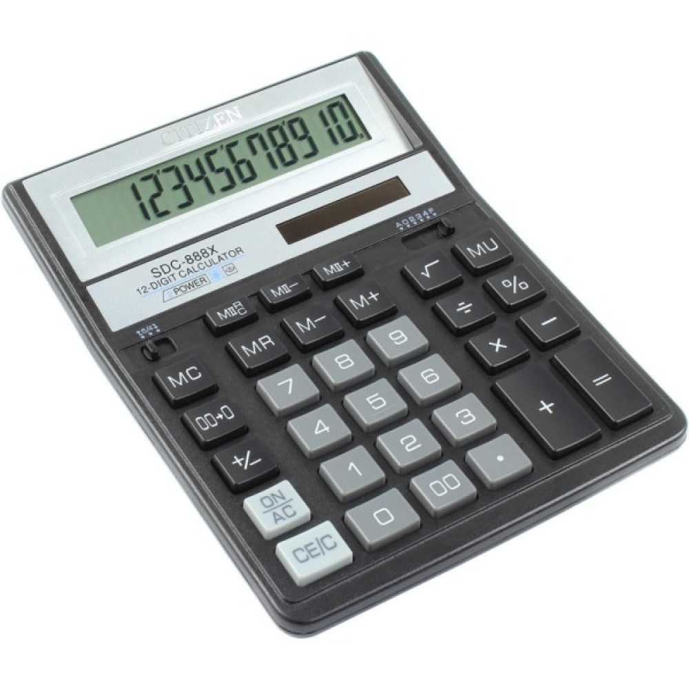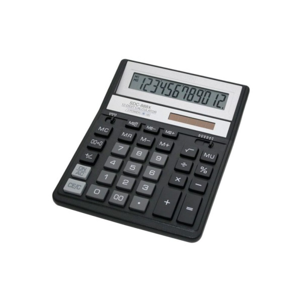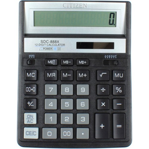 Калькулятор Citizen SDC-888XBK (1303XBK) дозволяє переглядати введені дані і вносити зміни. Присутній розрахунок торгової націнки, зміна знака, налаштування представлення десяткових чисел, кнопка "%", кнопка "00". Автоматичне відключення калькулятора. Особливості: розрядність: 12; клавіші введення розрядів: клавіша "00"; тип батареї: CR2032; тип пам'яті: дворівнева пам'ять; живлення: елемент живлення і сонячна батарея.