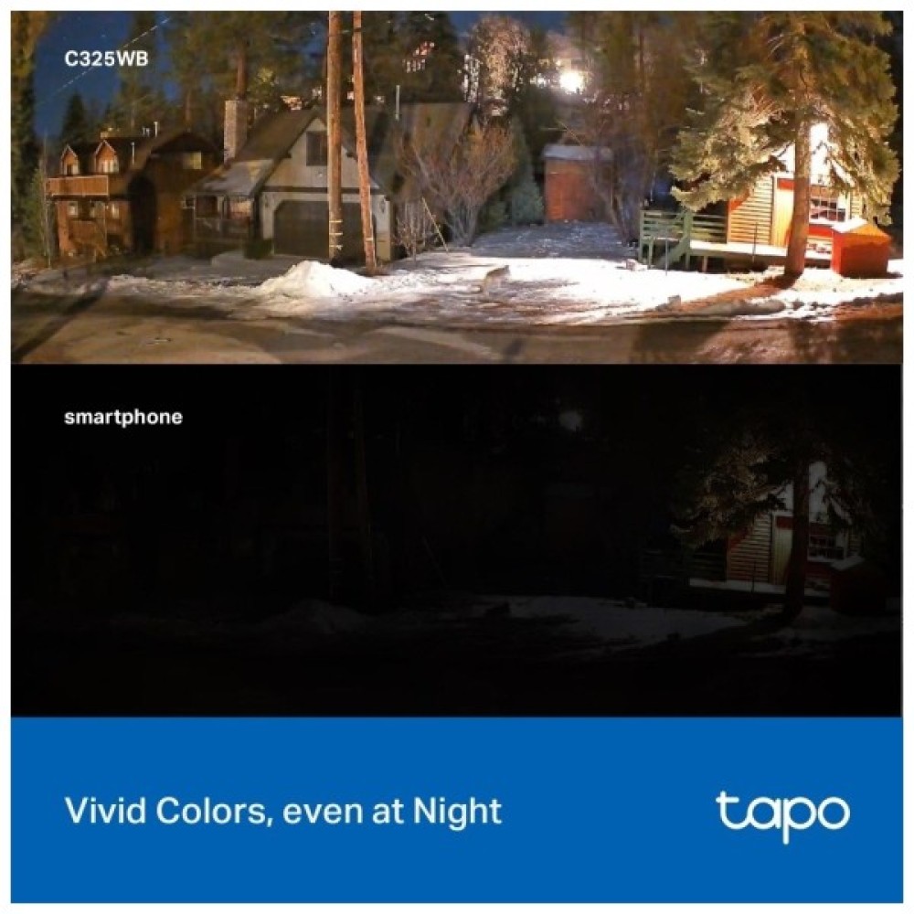 Камера Tapo C325WB передає яскраві кольори навіть в умовах наднизької освітленості (до 0,05 люкс), в результаті чого отримуються яскраві та чіткі зображення навіть у непроглядній темряві.