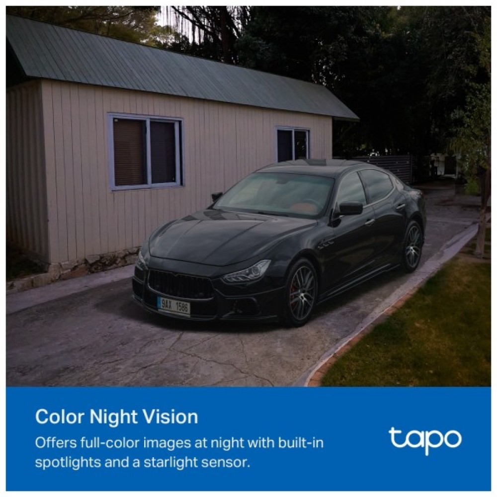 Замість чорно-білих зображень Tapo C425 пропонує повнокольорові зображення вночі завдяки вбудованим прожекторам і датчику зоряного світла, що забезпечують деталізацію в умовах низької освітленості.