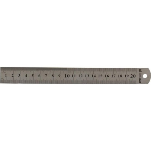 Лінійка BUROMAX 20см, steel - прямокутна, нержавіюча сталь, двостороння. Одна сторона: дві сантиметрових шкали, друга сторона: сантиметрова і дюймова шкала. Чохол з PVC плівки. Довжина 20 см.