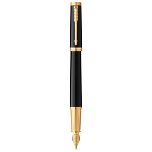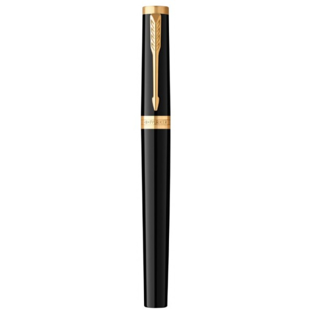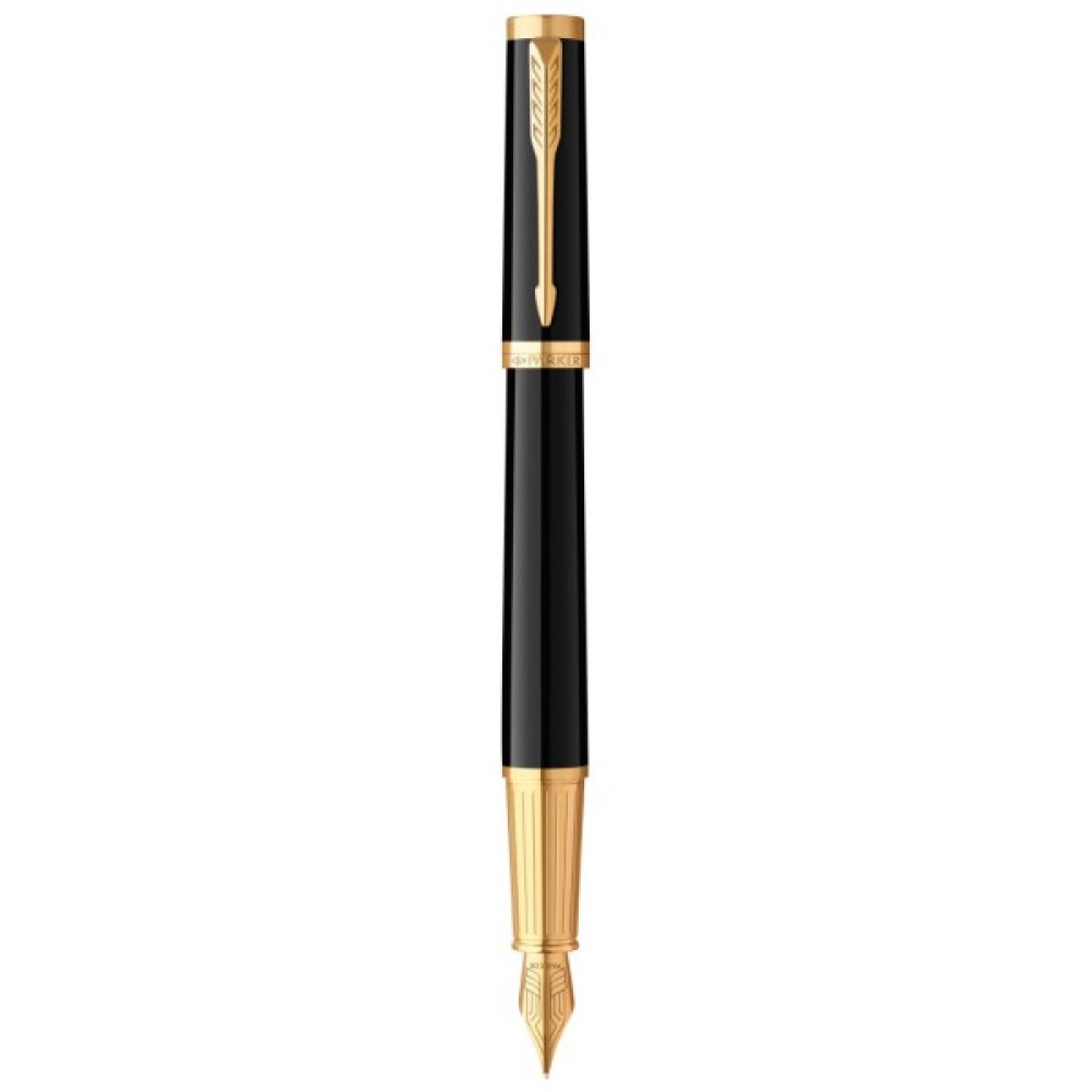 Латунний корпус з розкішним лаковим покриттям та позолоченим оздобленням елементів. Поєднання класичного чорного глянцю з блискучою позолотою та рифленим гравіюванням на зоні тримання створює дивовижний ансамбль. Впізнаваний затискач-стріла та вигравірувана назва бренду на кільці ковпачка - завершальні штрихи у бездоганному дизайні ручок Parker.