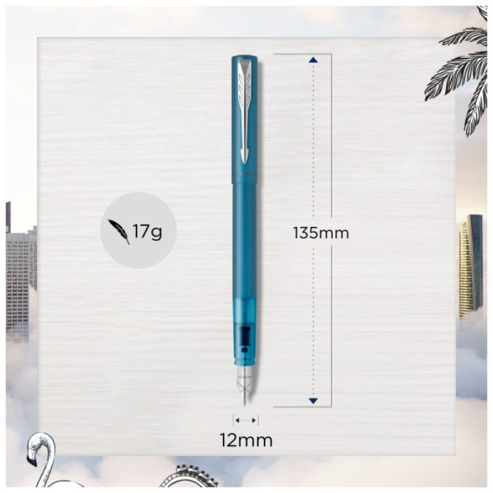 Оздоблення в дизайні бірюзового матового металіка доповнено хромуванням та фірмовим затискачем у вигляді стріли Parker. Унікальна прозора зона тримання, що відкриває внутрішню роботу пера. Комфортне велике перо із неіржавної сталі забезпечує стабільну роботу. Parker – це величезний досвід у сфері витонченого письма. Використовуйте ручку з картриджами для перових ручок або з конвертером для письма чорнилом з баночки (чорнило та конвертер продаються окремо).