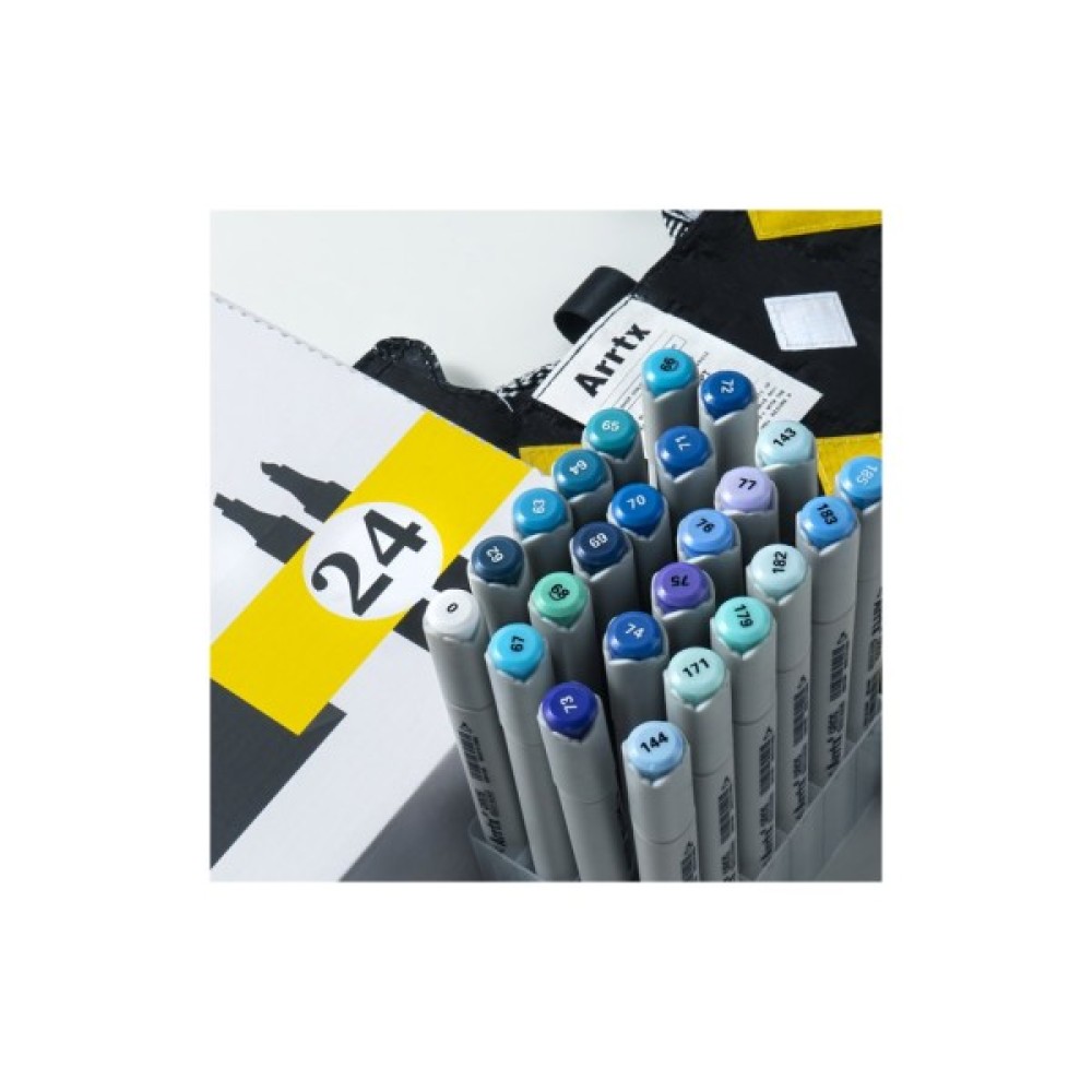 Комплектація: 24 маркери. Ткана сумка. Пластикова сітка. Картка для зразків кольорів. Стикери. Листівка Підставка. Коробка для зберігання й перенесення.