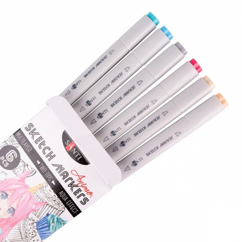 Скетч-маркери SANTI - це безмежні можливості для ваших малюнків! У тематичному наборі "Anime" підібрані 6 відтінків, за допомогою яких можна створити зображення коханих персонажів «аниме». Водорозчинні, світлостійкі чорнила призначені для живопису і малювання в змішаних техніках. Поєднують в собі властивості маркерів і акварельних фарб. Для досягнення акварельного ефекту можна розмити деталі малюнка за допомогою змоченого водою пензля на папері або розбавити водою чорнило на палітрі. Оснащені двома видами наконечників: м'який пензель для точної деталізації малюнка і долото - для заповнення великих фрагментів. Для роботи можна використовувати акварельний папір або спеціальний папір для малювання маркерами. Склад набору : 016 тілесний, 023 айвори, 034 коралово-рожевий, 032 сірий, 039 небесно-блакитний, 041 тиффани.