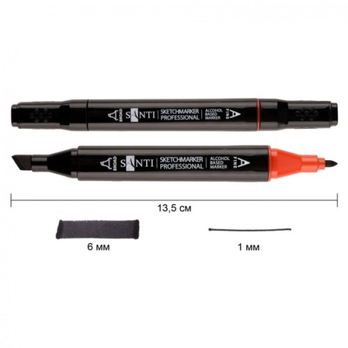 Набір спиртових маркерів SANTI для малювання. Підходять для створення художніх робіт у різних техніках, включаючи скетчінг, каліграфію та ілюстрування. У наборі 40 маркерів різного кольору, для зручності назва кольору нанесена на ковпачок. Кожен маркер має два наконечники різної форми: загострений наконечник для тонких ліній та плоский зі скошеним стрижнем для широких штрихів. Чорнило на спиртовій основі добре вбирається в папір. Рекомендується використовувати для малювання спеціальні альбоми, цупкі аркуші паперу або картон. Кольори добре поєднуються між собою. Корпус виготовлений із поліпропілену.