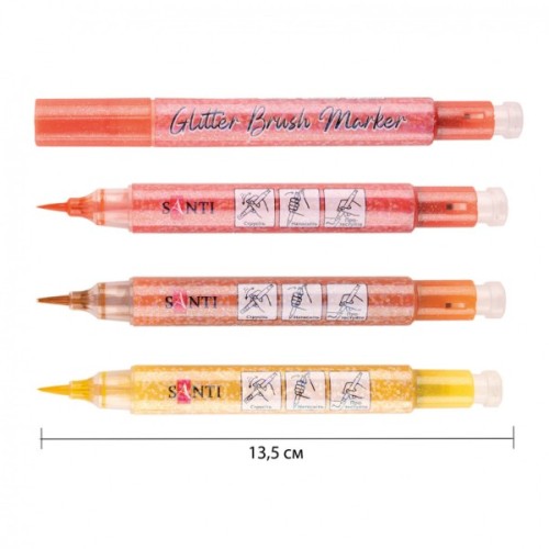Маркери акварельні SANTI "Glitter Brush" ідеально підходять для виконання художніх робіт у різних технiках, включаючи скетчiнг та ілюстрування. Гнучкий наконечник у формі пензлика підходить для малювання штрихів змінної товщини та зафарбовування. Чорнило на водній основі. Упаковка: 3 шт. Корпус виготовлений з поліпропілену.