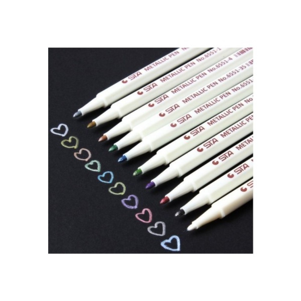 Художні маркери серії Metallic color pen малюють лінії з імітацією золотої або срібної фарби (ефект металік). Красиві металічні кольори неймовірно популярні серед дітей і дорослих. Чорнило цих маркерів чудово лягає на темному папері, кераміці, склі та інших непористих поверхнях. Підходять дітям для їхніх захоплень: малювання, розмальовування на чашках, склі тощо. Написи з таких поверхонь змиваються легко за допомогою мийних неабразивних засобів.