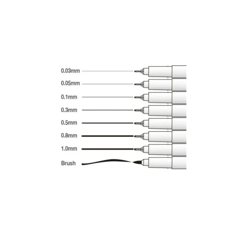 Розміри стержня : 0.03, 0.05, 0.1, 0.3, 0.5, 0.8, 1.0, а також мульти-лайнер пензель, який дозволяє отримати лінії від 0,2 до 5мм.