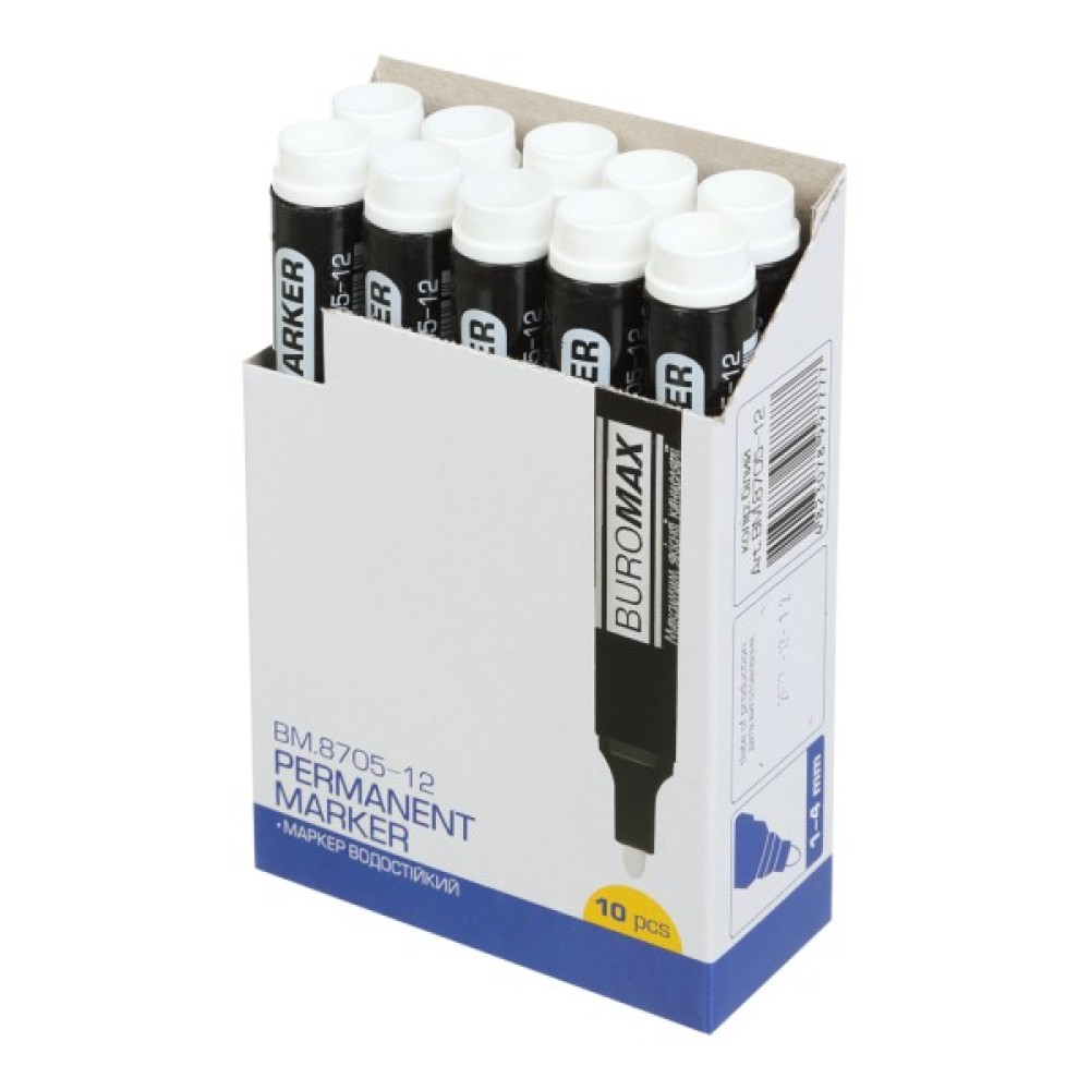 Водостійкий маркер BUROMAX наносить водо- та світлостійкі написи практично на будь-яку поверхню: папір, картон, дерево, гуму, кераміку, пластик, скло, метал, шкіру, тканину тощо. Ефективний для робіт за межами і всередині приміщень, як для професійного використання (маркування на складі, роботи в рамках логістичних процесів, в рітейлі), так і для побутових потреб (персоналізація особистих речей та дитячого шкільного приладдя, спортивного та туристичного інвентарю, гарнір та т.п.).