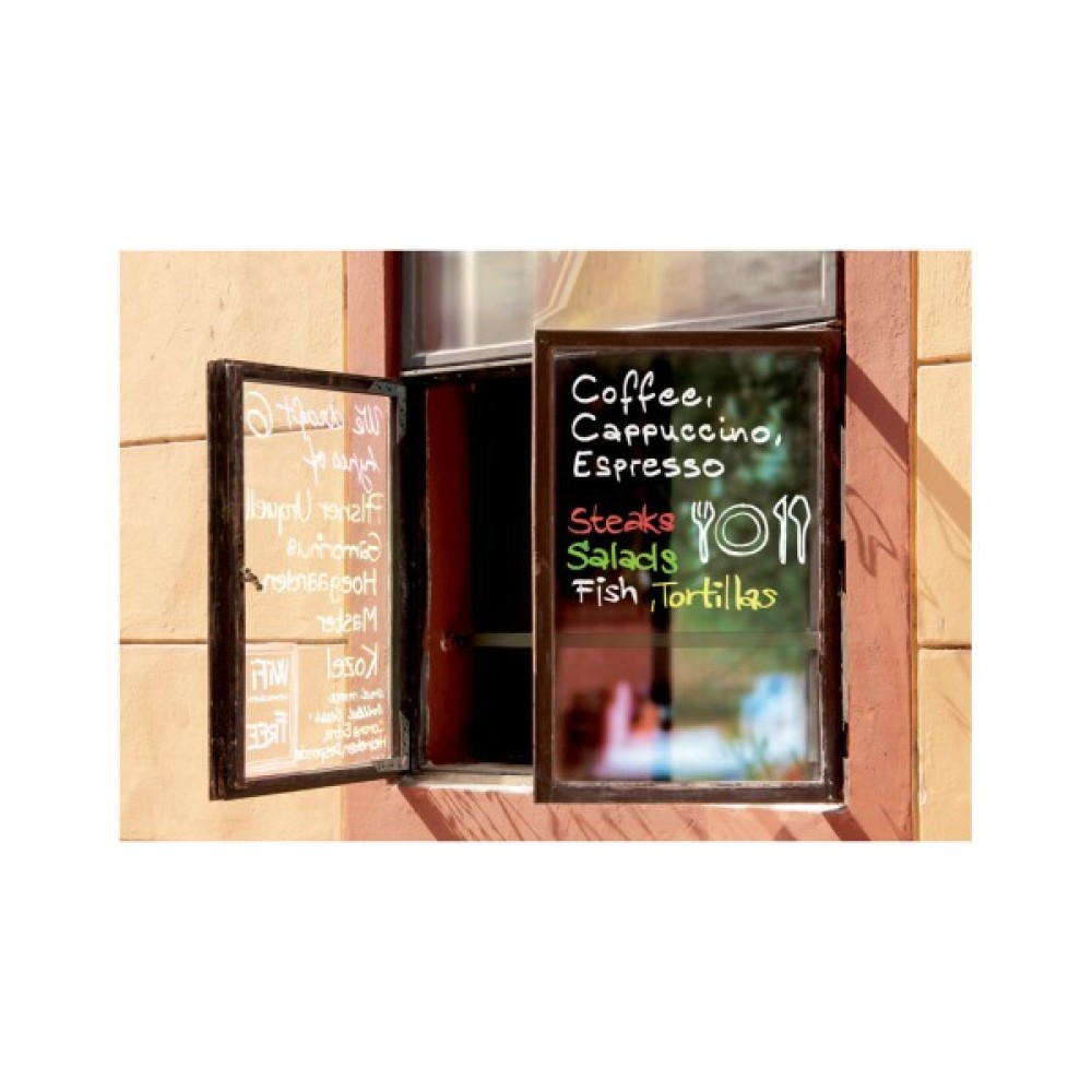 Маркери для вікон і гладких поверхонь. Чорнило на основі розведеної крейди, містить високу концентрацію крейдяних частинок, що дає йому змогу добре лягати на поверхню, залишаючи густу, щільну лінію. Стирається з гладких поверхонь сухою губкою, із шорсткої видаляється водою. Без запаху, не токсичне. Корпус із міцного пластику. Стійкий до стирання писальний вузол. Форма писального вузла — клинувата, ширина лінії 4-12 мм. Світлостійке чорнило.