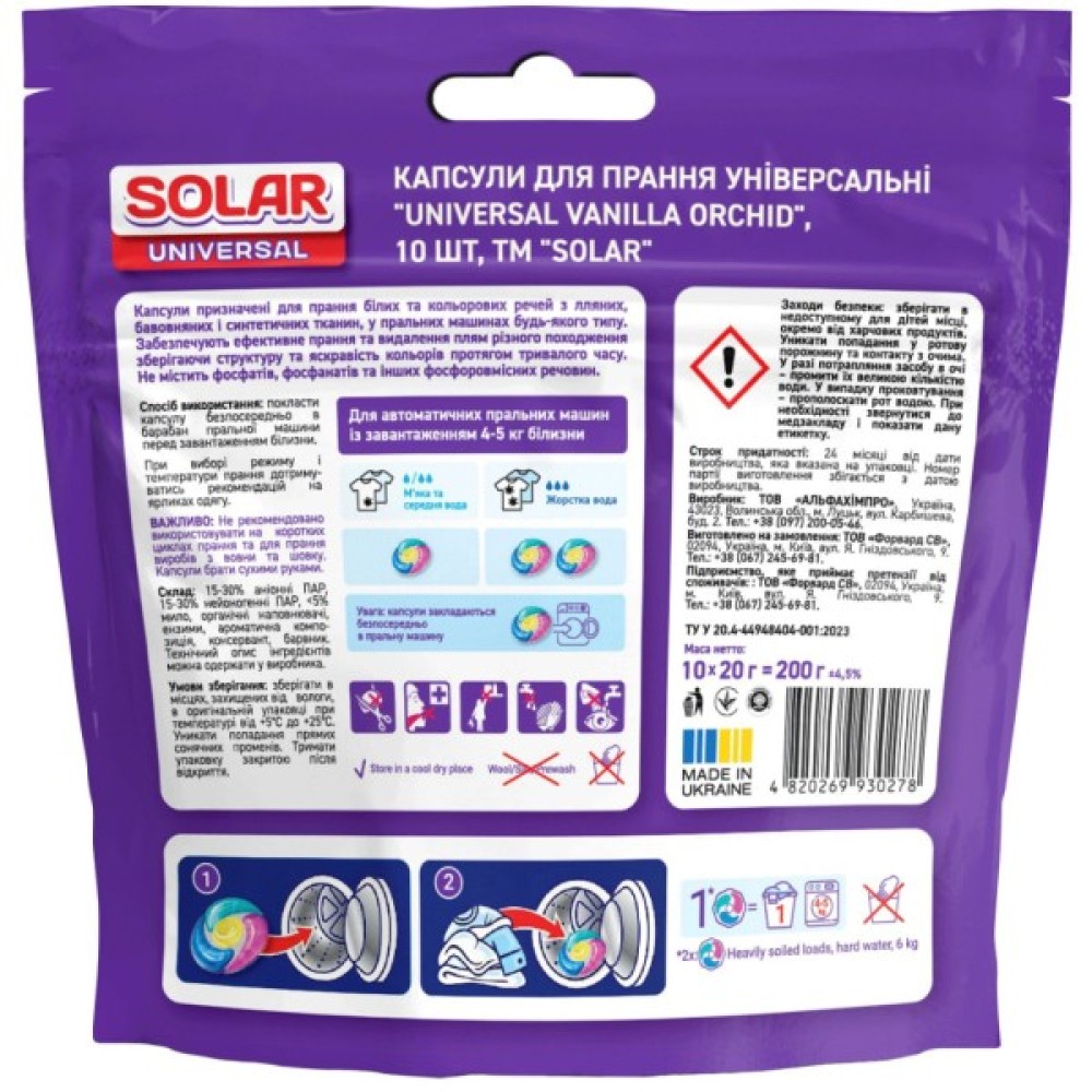 Капсули призначені для прання білих та кольорових речей із лляних, бавовняних і синтетичних тканин у пральних машинах будь-якого типу.