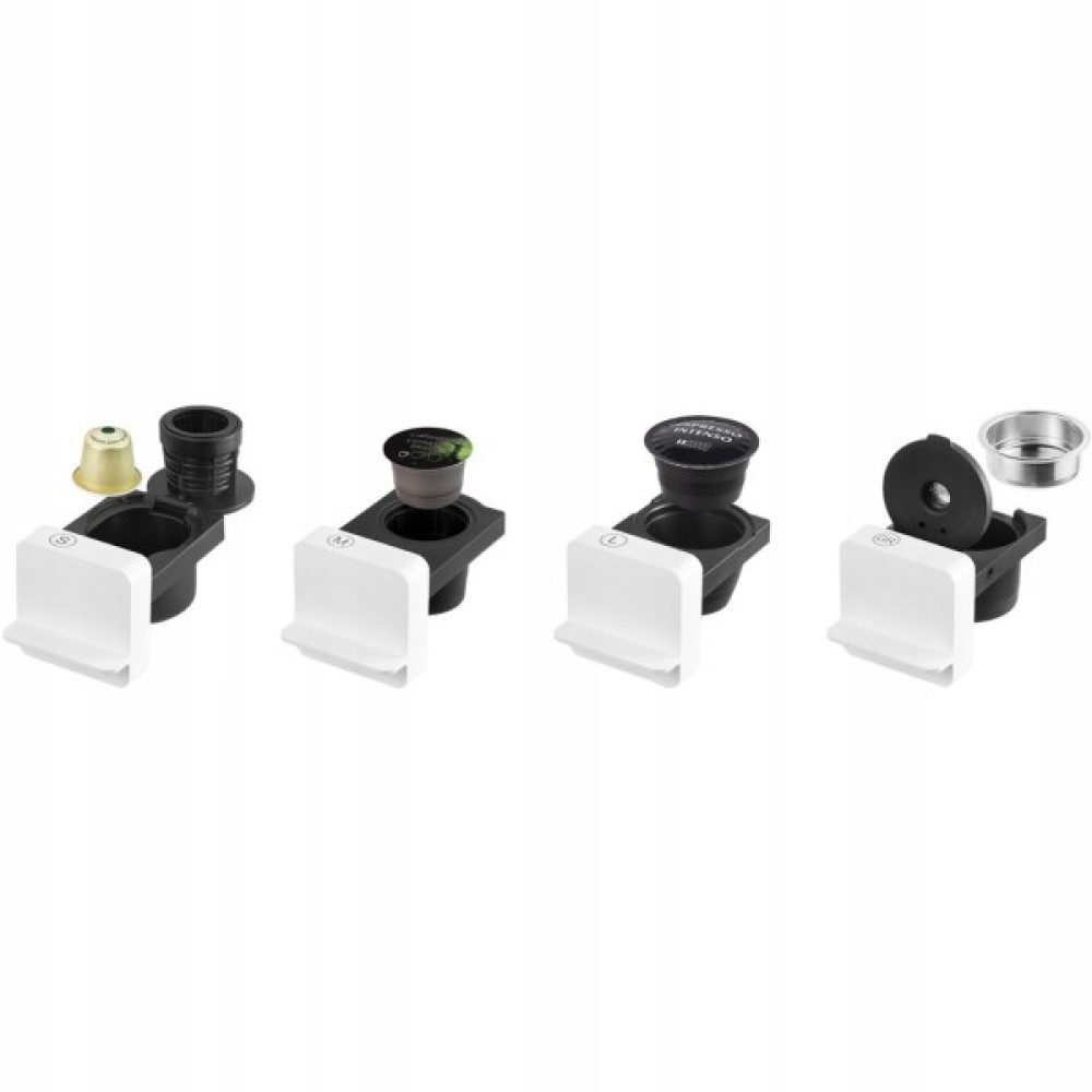 Кавоварка призначена для всіх найбільш популярних видів кавових капсул. 3 адаптери для капсул (S - Nespresso, M - Caffissimo/Tchibo, L - Dolce Gusto) і 1 адаптер для меленої кави.