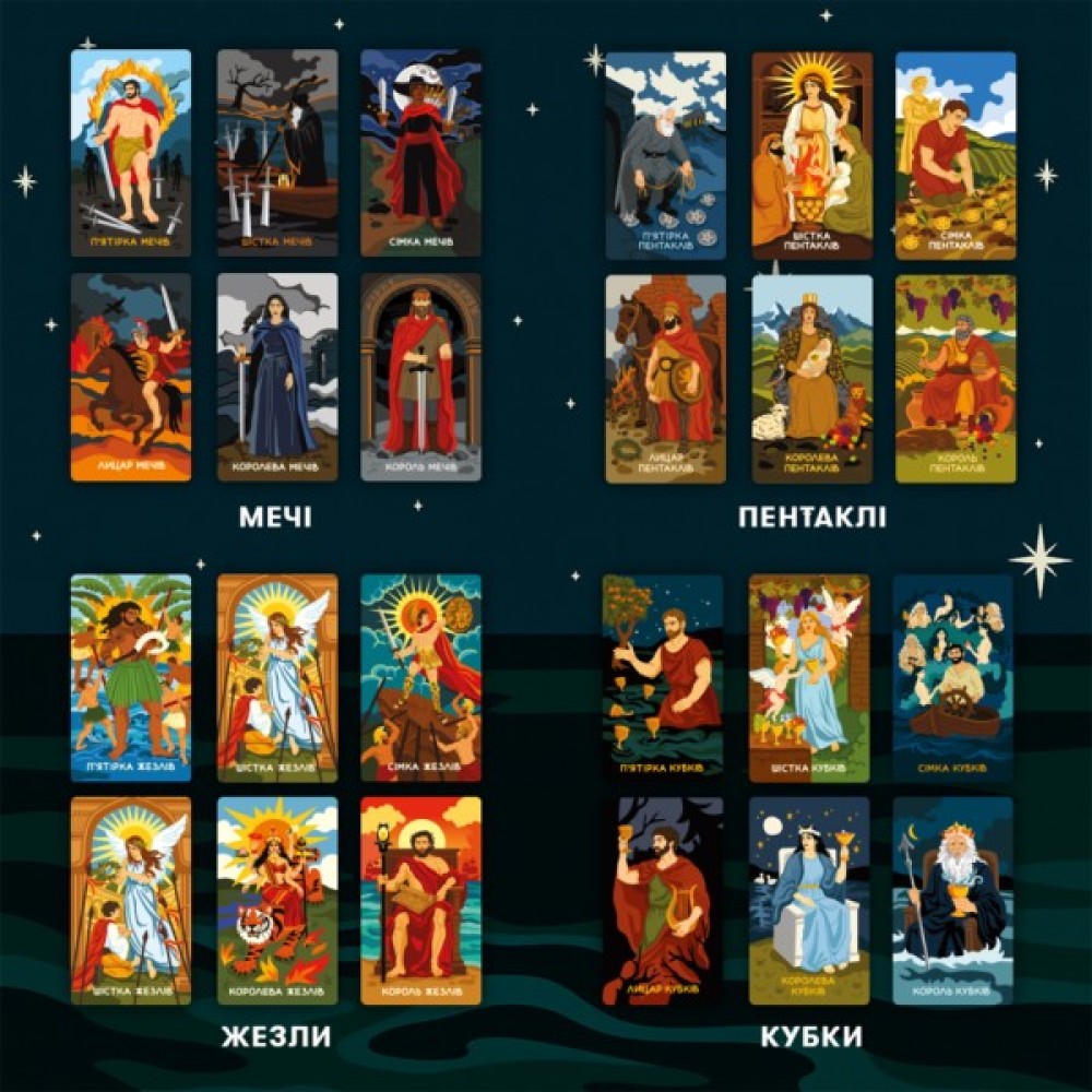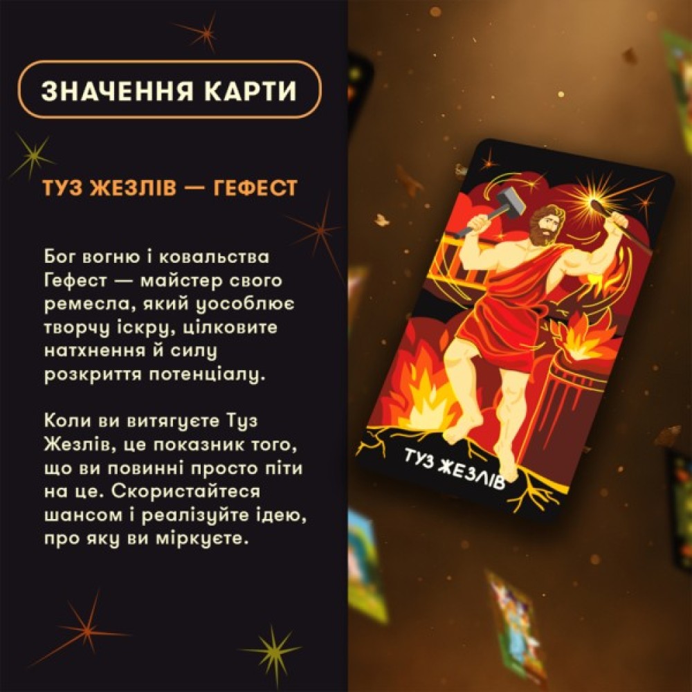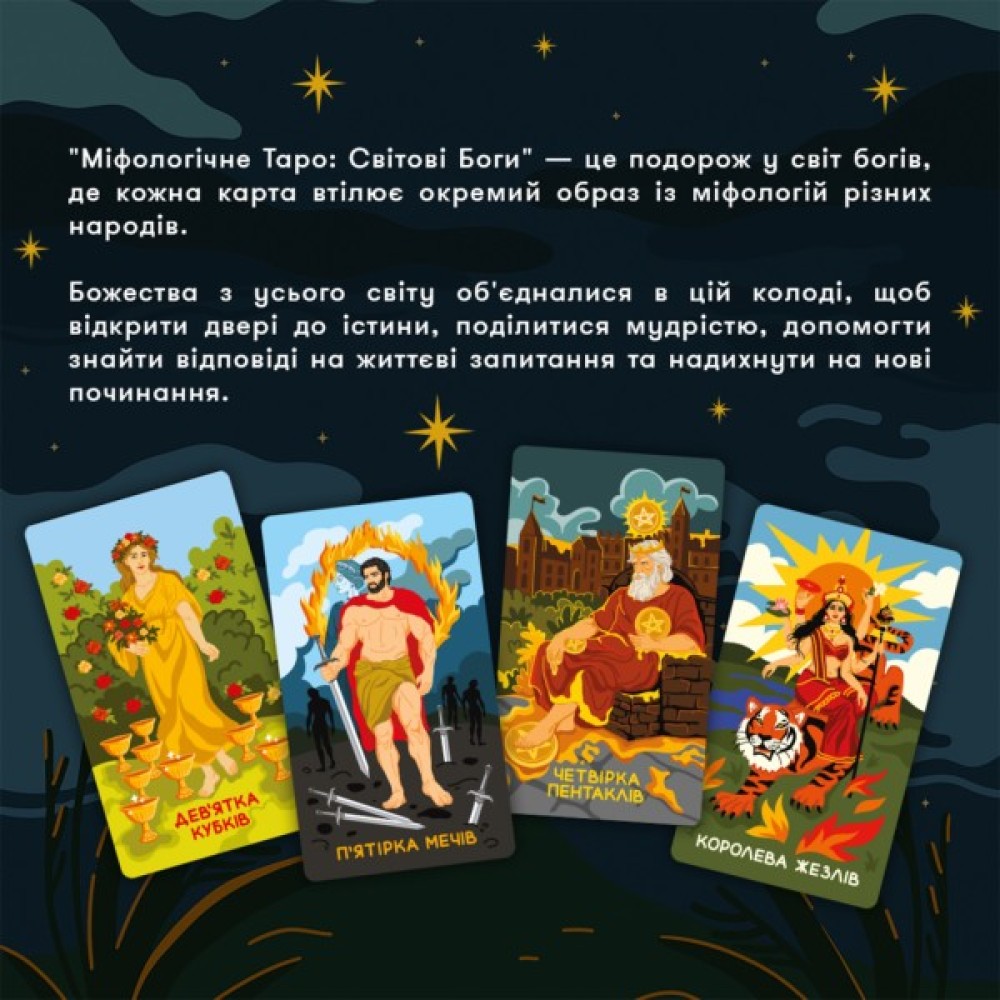 Крім того, що ця колода дуже хороша, вона ще й ой, яка цікава! Кожна карта містить ілюстрацію божества, історія чи життєві вибори якого розкривають суть карти та її значення. І якщо раптом бог, богиня чи інший міфологічне творіння вам не знайоме – не біда!