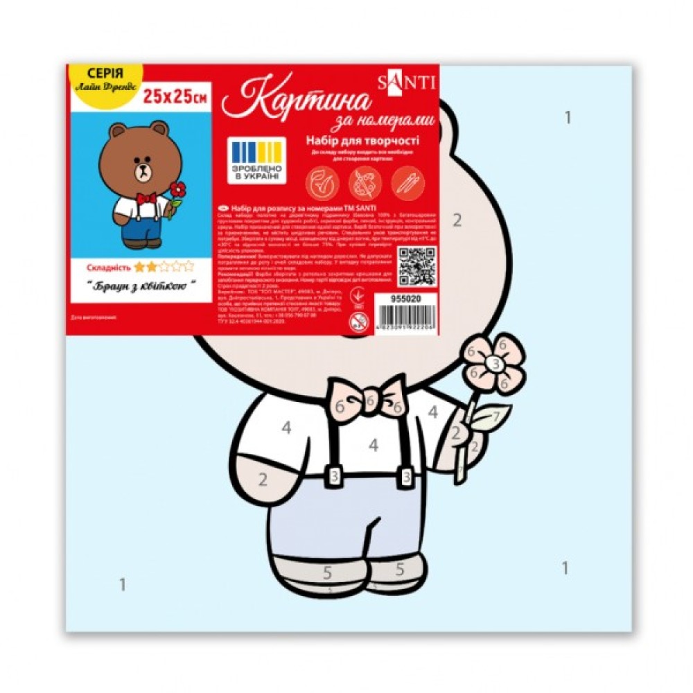 Картина за номерами ТМ SANTI "Лайн Френдс. Браун з квіткою" - це можливість створити мальовничий шедевр без спеціальної підготовки. Точні пронумеровані контури на полотні допоможуть легко орієнтуватися у процесі малювання. Такий формат також сприяє швидкому освоєнню та запам'ятовування цифр в ігровій формі — дитина асоціюватиме їх з яскравими фарбами та елементами малюнка, що робить навчання простим та веселим. Для зручності малюків пронумеровані сегменти полотна попередньо пофарбовані у відповідні кольори, що полегшує процес розфарбовування і допомагає швидше орієнтуватися в малюнку. У наборі використовуються акрилові фарби, вони легко лягають на полотно, швидко висихають, дозволяючи дитині побачити результат одразу після завершення роботи. Набір для творчості виготовлений з натуральних, екологічно чистих матеріалів, що робить малювання комфортним і безпечним навіть для найменших художників.