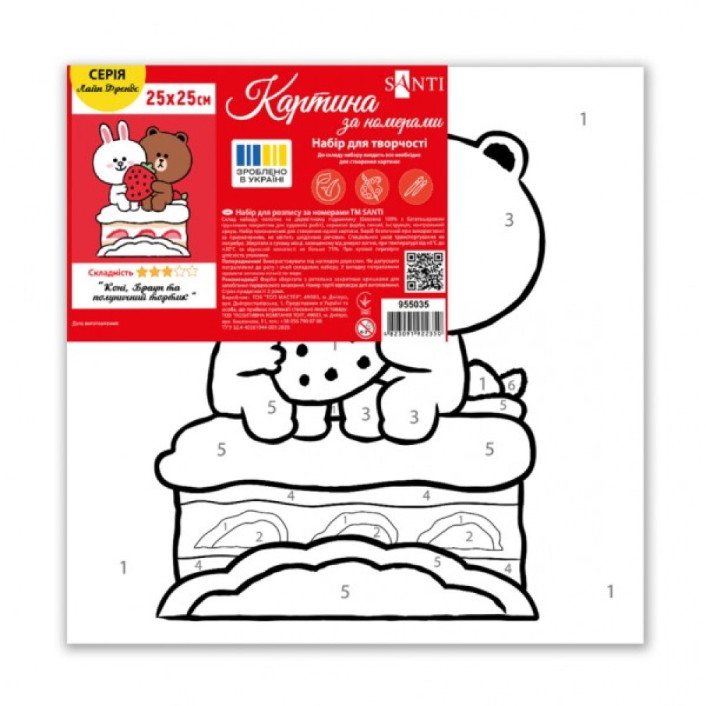 Картина за номерами ТМ SANTI "Лайн Френдс. Коні, Браун та полуничний тортик" - це можливість створити мальовничий шедевр без спеціальної підготовки. Точні пронумеровані контури на полотні допоможуть легко орієнтуватися у процесі малювання. Такий формат також сприяє швидкому освоєнню та запам'ятовування цифр в ігровій формі — дитина асоціюватиме їх з яскравими фарбами та елементами малюнка, що робить навчання простим та веселим. У наборі використовуються акрилові фарби, вони легко лягають на полотно, швидко висихають, дозволяючи дитині побачити результат одразу після завершення роботи. Набір для творчості виготовлений з натуральних, екологічно чистих матеріалів, що робить малювання комфортним і безпечним навіть для найменших художників.