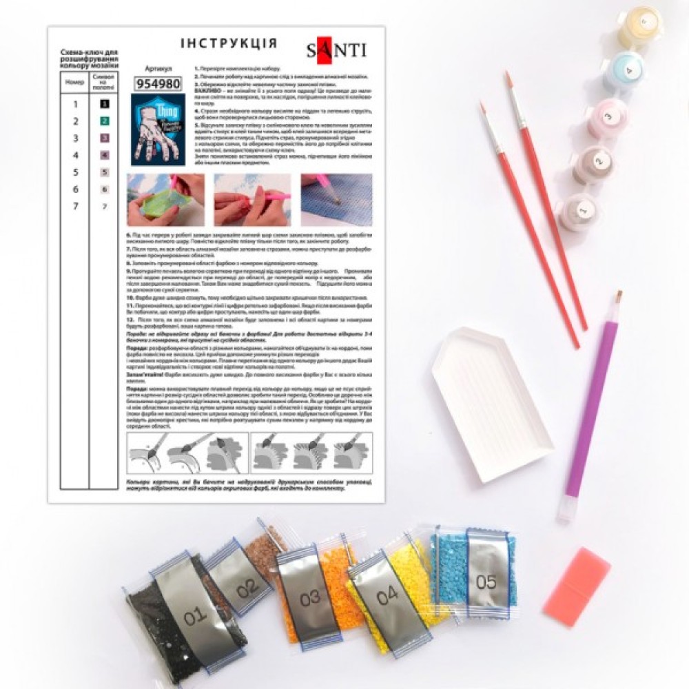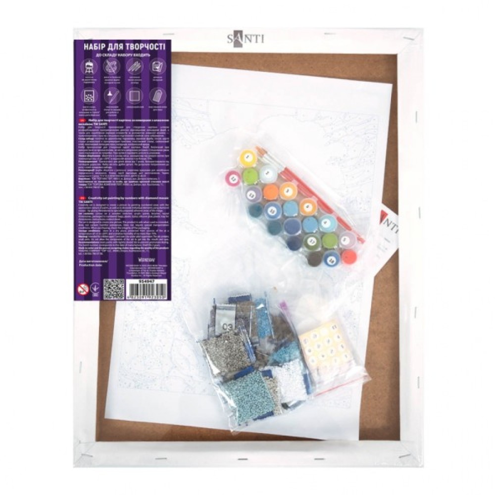 Картина за номерами з алмазною мозаїкою 2 в 1 ТМ SANTI складається з полотна розміром 30х40 см, натягнутого на дерев'яний підрамник. Зображення на полотні поділено на зони: ділянки для розфарбовування розмічені цифрами, кожна з яких відповідає певному кольору акрилової фарби, а ділянки для алмазної мозаїки покриті клейовим шаром і мають маркування. У набір також входять акрилові фарби, пензлі, акрилові гранені стрази різних кольорів, стілус (спеціальний олівець) для зручного захоплення каміння, пластиковий лоток для їх сортування, силіконовий клей/віск, контрольний лист та докладна інструкція. Поєднання гладких поверхонь і об'ємних сяючих страз створює дивовижний 3D-ефект — картина набуває глибини, гри світла та блиску, створюючи вражаючий візуальний ефект.