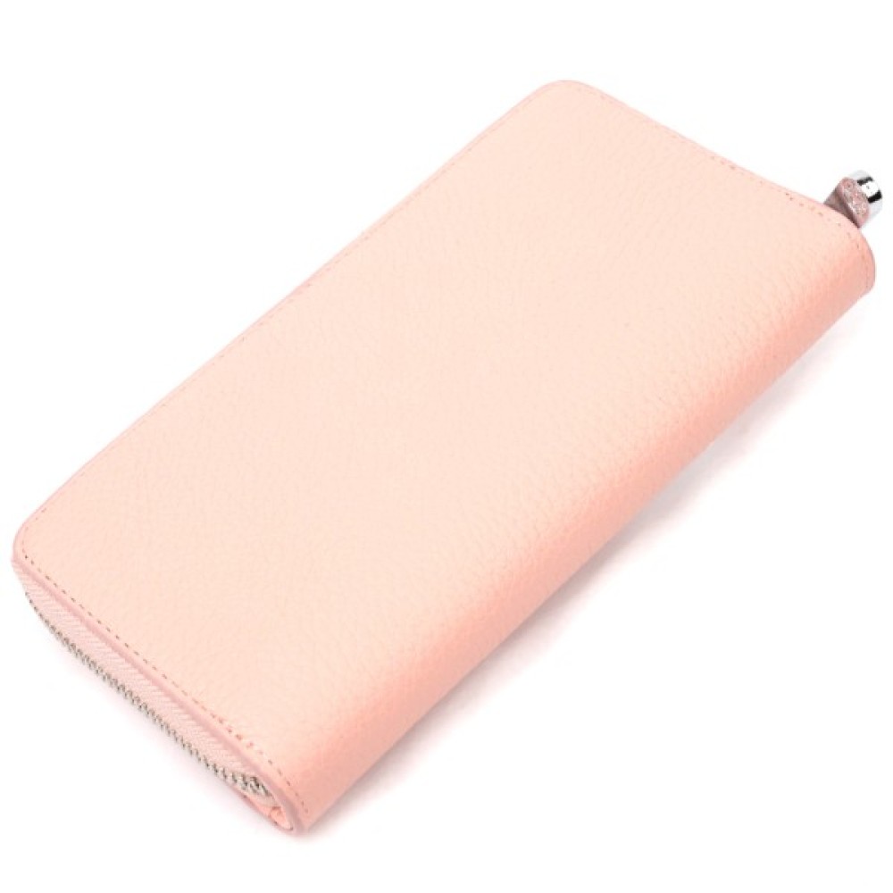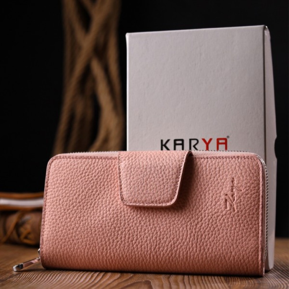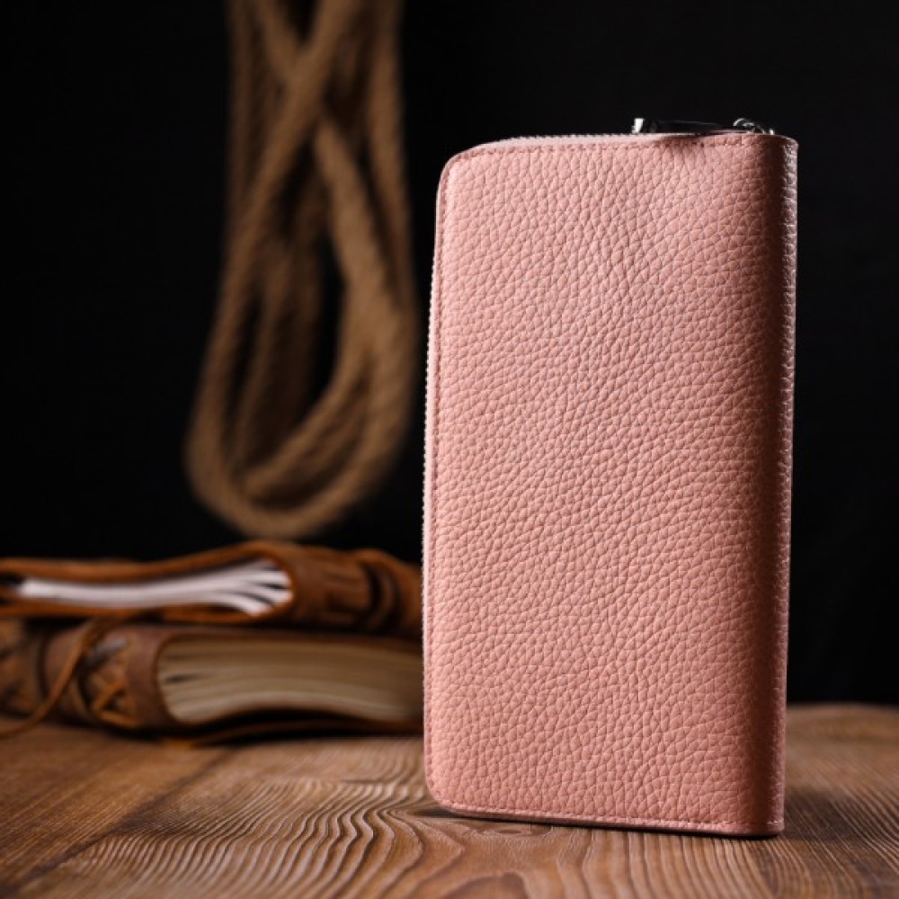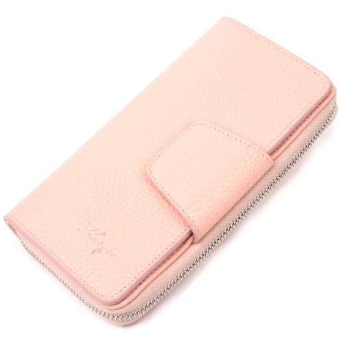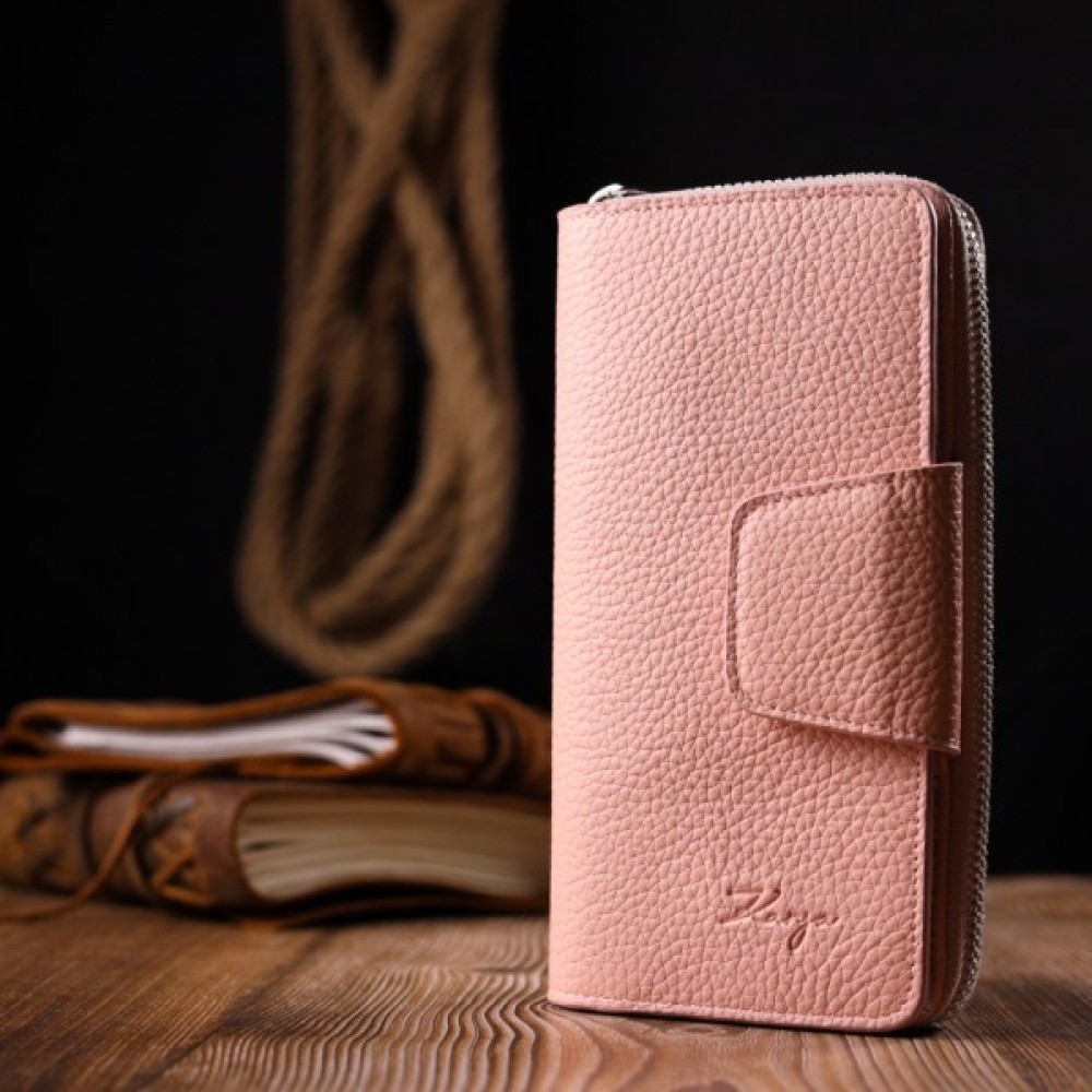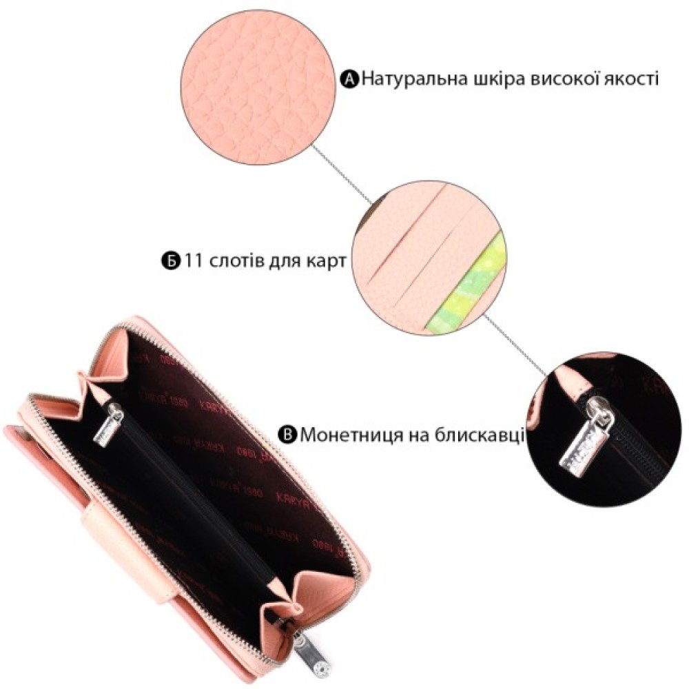 Незвичний жіночий гаманець із якісної натуральної шкіри. Виріб складається з двох частин: перша — для купюр у нескладеному вигляді та монет, що закривається на блискавку, друга — для карток та документів, закривається клапаном на магніт.