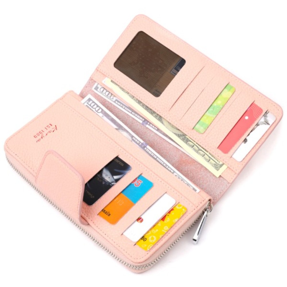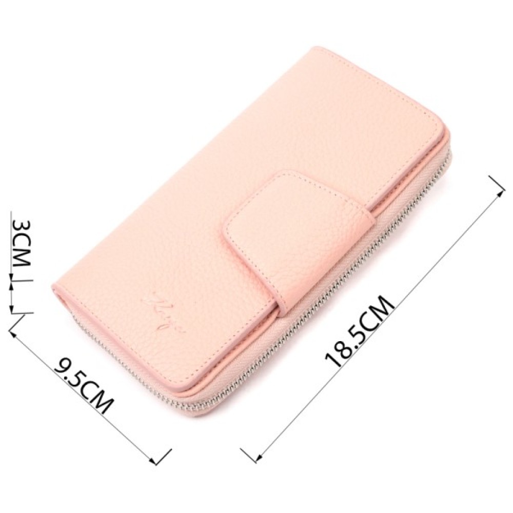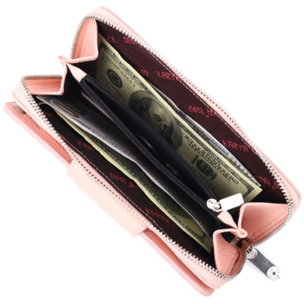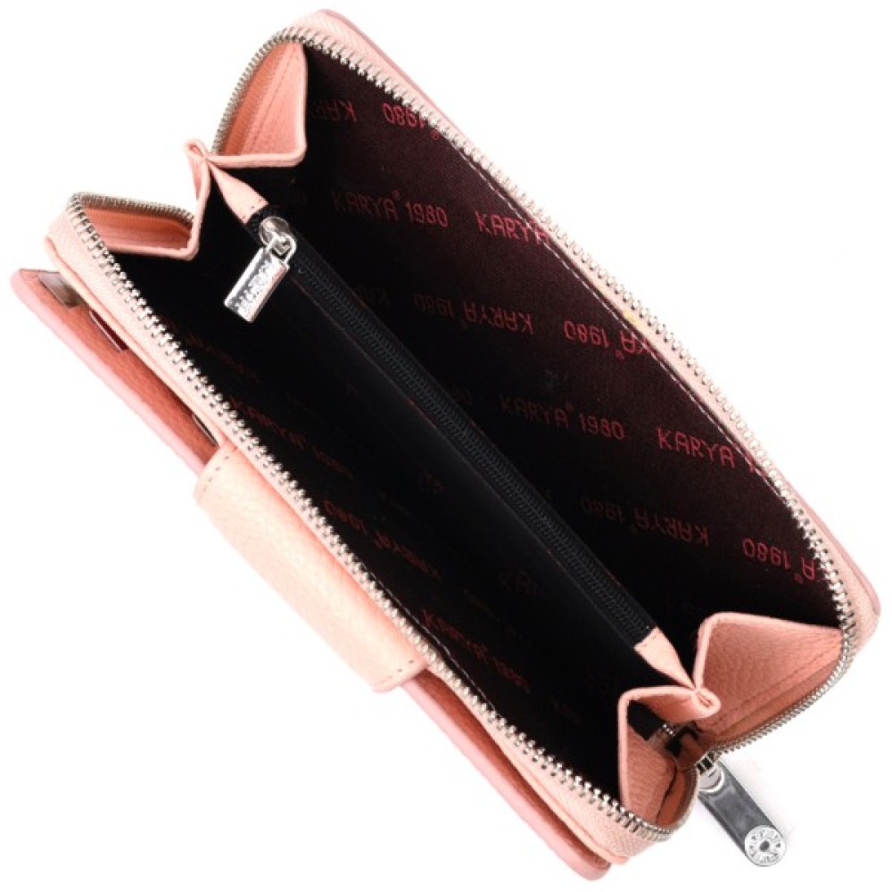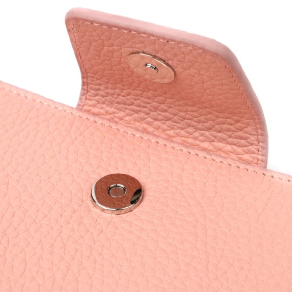 Незвичний жіночий гаманець із якісної натуральної шкіри. Виріб складається з двох частин: перша — для купюр у нескладеному вигляді та монет, що закривається на блискавку, друга — для карток та документів, закривається клапаном на магніт.