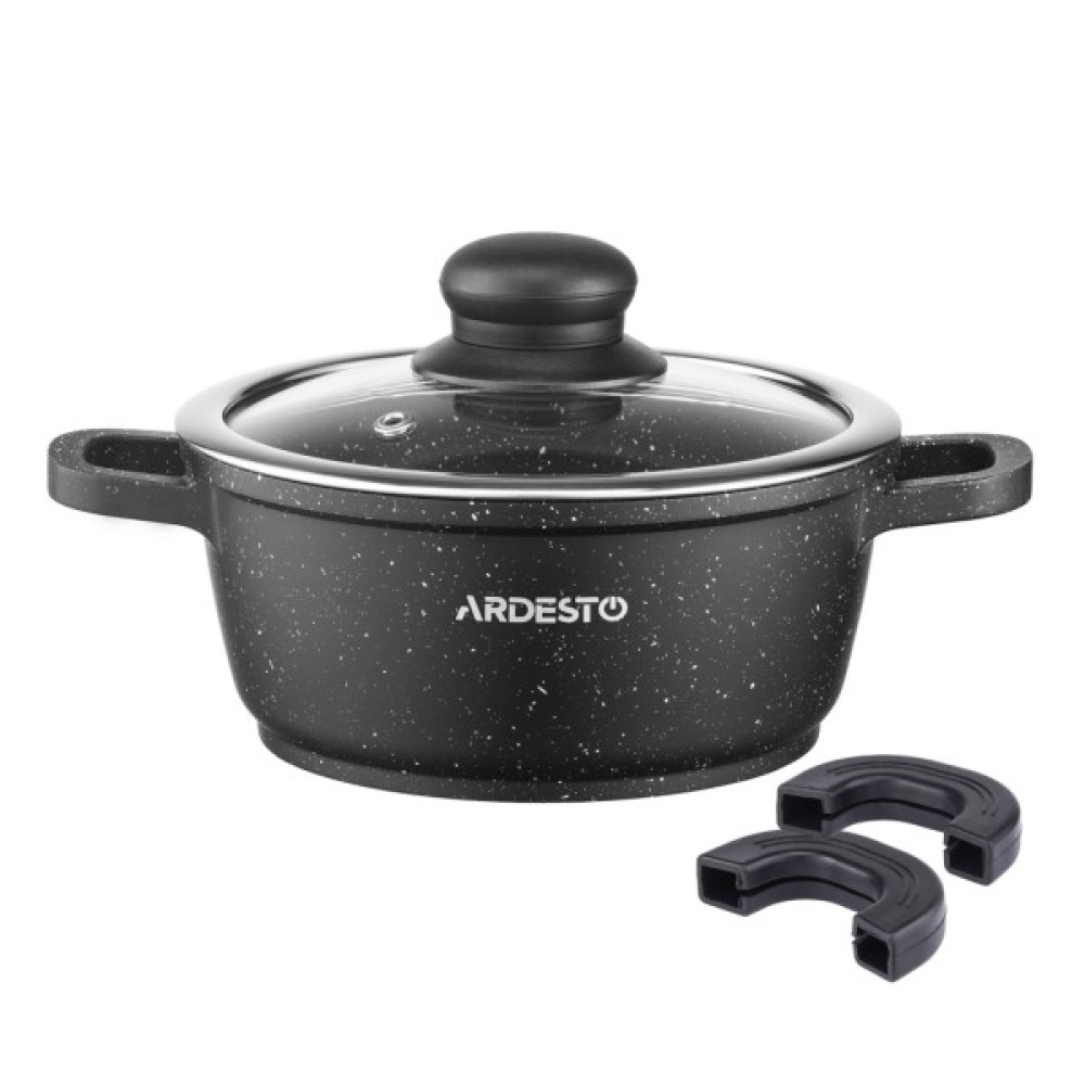 Каструлю ARDESTO Gemini Anzio виготовлено з литого алюмінію. Завдяки протипригарному мармуровому покриттю процес приготування буде суттєво простішим. Особливістю виробу є знімні силіконові накладки на алюмінієві руків’я, які забезпечують комфортне та безпечне переміщення каструлі, навіть коли її розігріто. Скляна кришка, яка також є в комплектованні, має отвір для відведення пари.