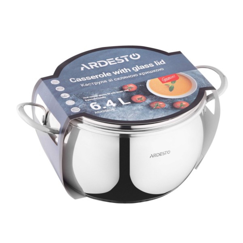 Каструлю ARDESTO Gemini Liguria класичної форми виготовлено з нержавіючої сталі – гігієнічного та довговічного матеріалу. Завдяки об’єму 6,4 л згодиться для приготування страв у великих родинах. Дно завтовшки 3 мм є запорукою, що страва не пригорить і не пристане. Посуд можна використовувати для приготування на газовій, електричній, склокерамічній, галогенній чи індукційній плиті. Зручності використання додає мірна шкала на стінках каструлі та скляна кришка з отвором для пари. Виріб можна мити в посудомийній машині.