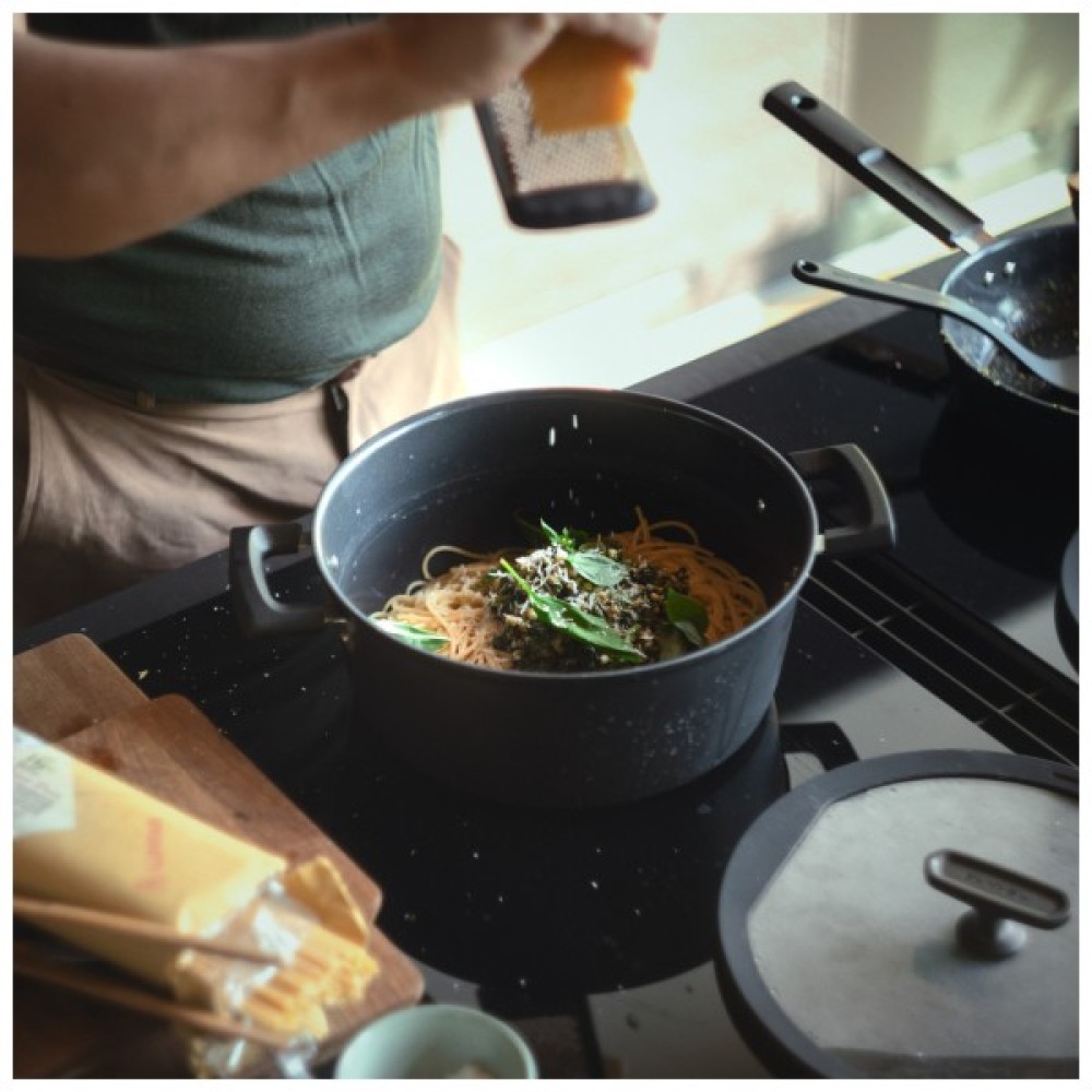 Виготовлено у Фінляндії зі 100% переробленого алюмінію, посуд швидко й рівномірно нагрівається на всіх типах плит, включаючи індукційну, а завдяки енергозберігаючій основі Energy Base дно нагрівається на 50% швидше, тим самим економить 30% електроенергії, що є особливо ефективним для керамічних поверхонь.