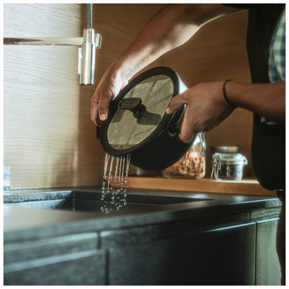 Комплект доповнено кришкою з м’яким силіконовим кантом для тихого використання та 2-ма функціональними зонами зливу рідини, а пласка форма займає мінімум місця, економлячи простір на кухні.