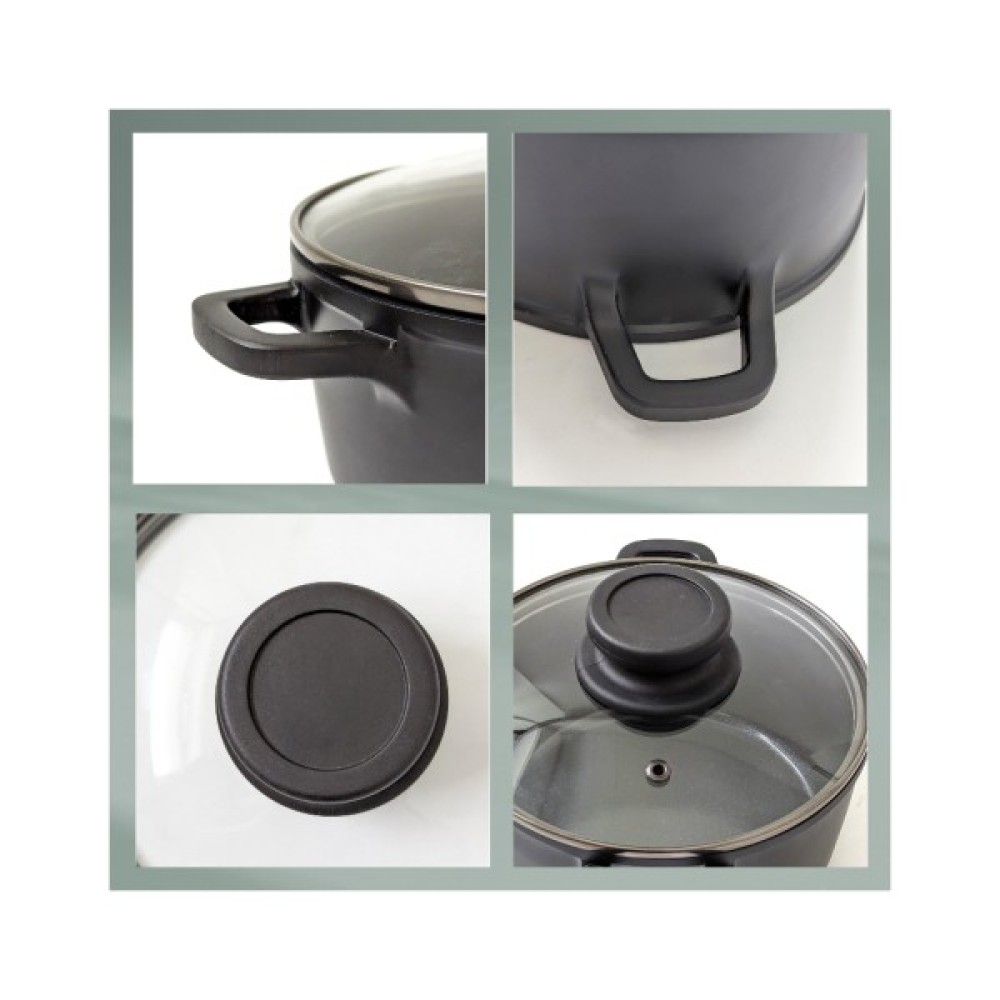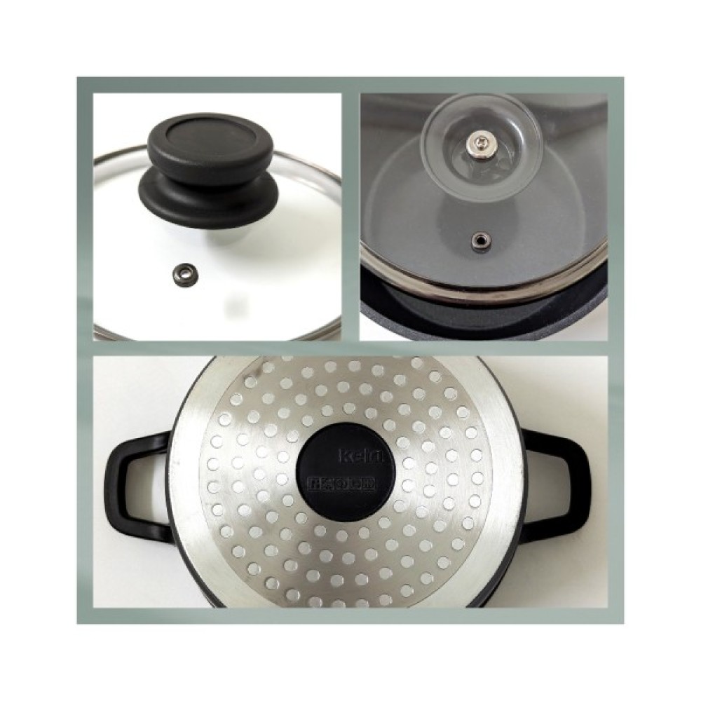 • Кришка: виготовлена з термостійкого скла з металевою окантовкою, що дозволяє контролювати процес приготування без необхідності знімати її.