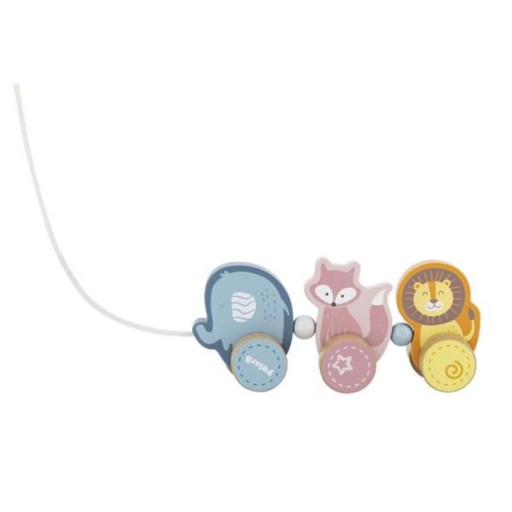Дерев'яна каталка від Viga Toys серії PolarB виконана у вигляді низки милих тварин: слона, лисиці та лева, на шести колесах зі шнурком.