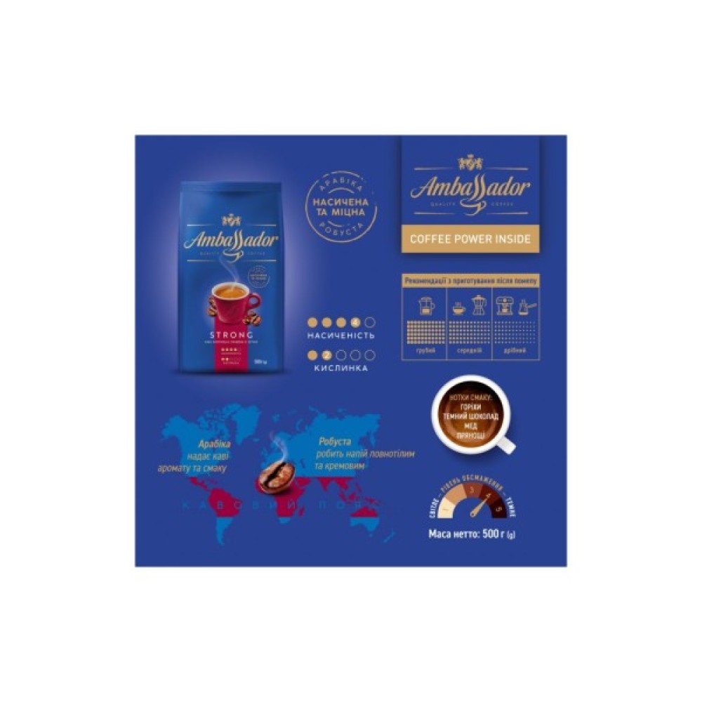 Ambassador Strong — композиція зерен темного обсмаження з виразним смаком із нотками темного шоколаду, прянощів, горіхів і медовою солодкістю. Арабіка наповнює кавовий букет ароматом, у той час як робуста робить напій повнотілим і кремовим. Дуже добре підходить для приготування насиченого еспресо та прекрасно поєднується з молоком.