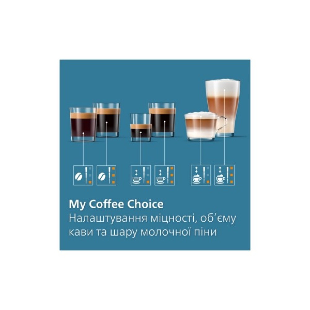 Сучасний сенсорний дисплей із кольоровими піктограмами дозволяє легко вибирати улюблені напої. Приготуйте каву, яку ви любите, за допомогою меню My Coffee Choice: виберіть бажану міцність, об'єм напою та шар молочної пінки на свій смак.