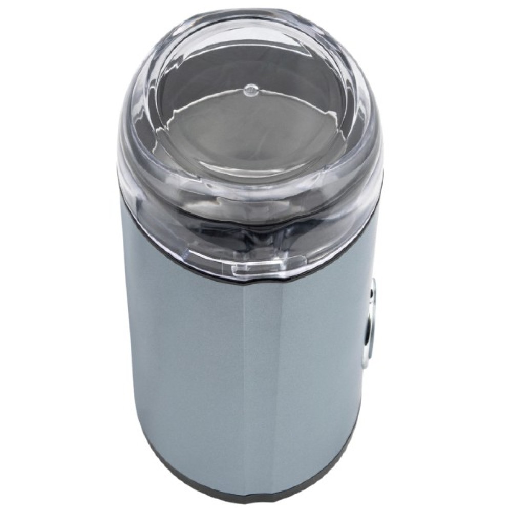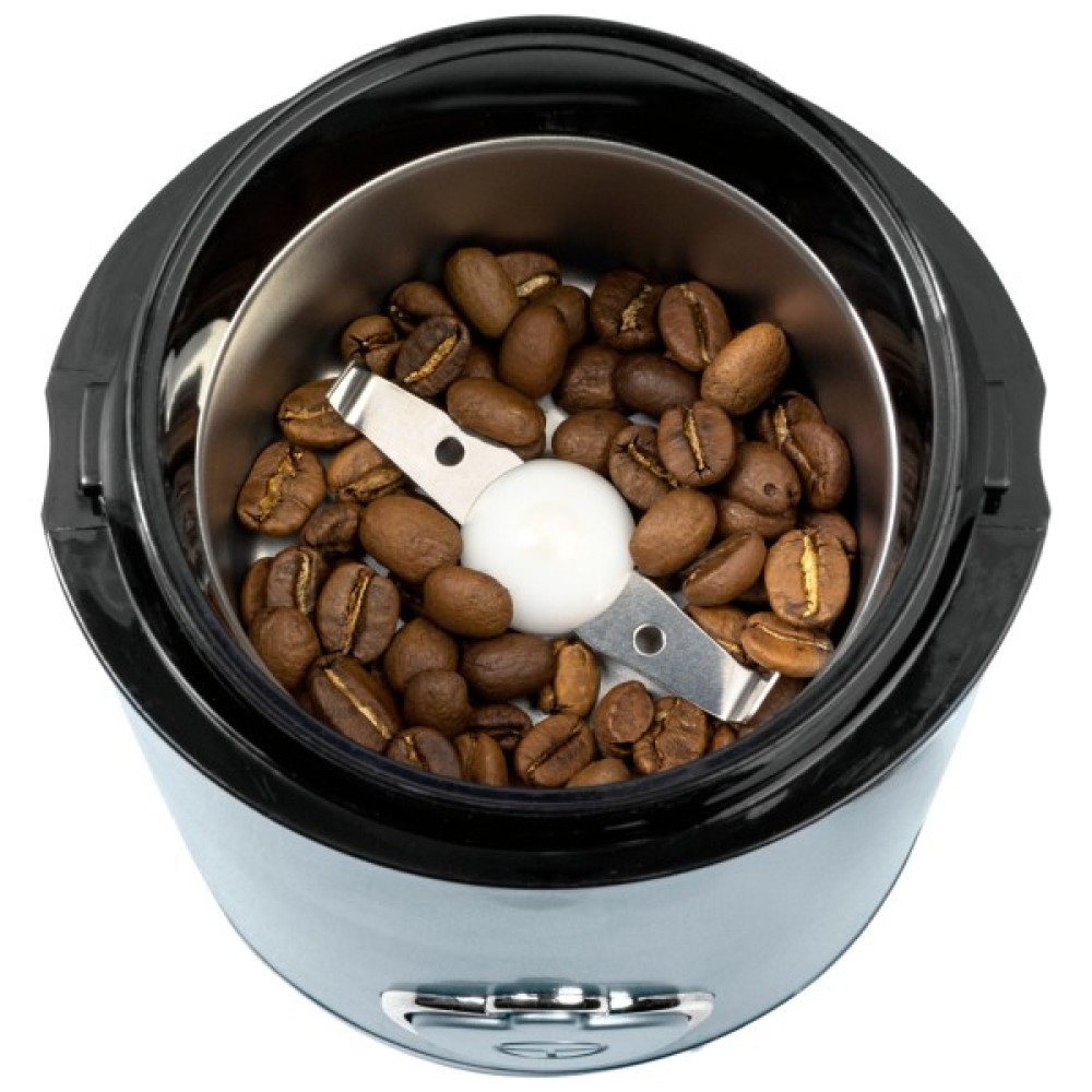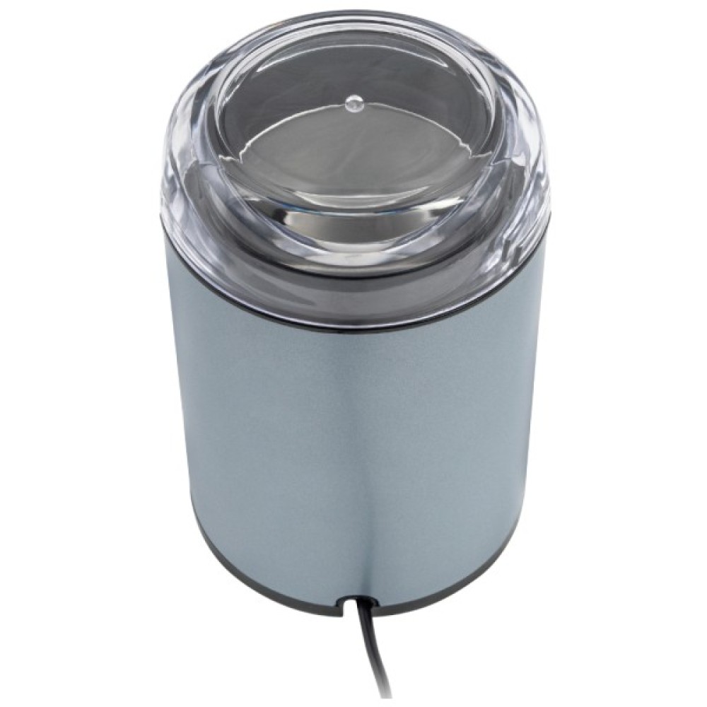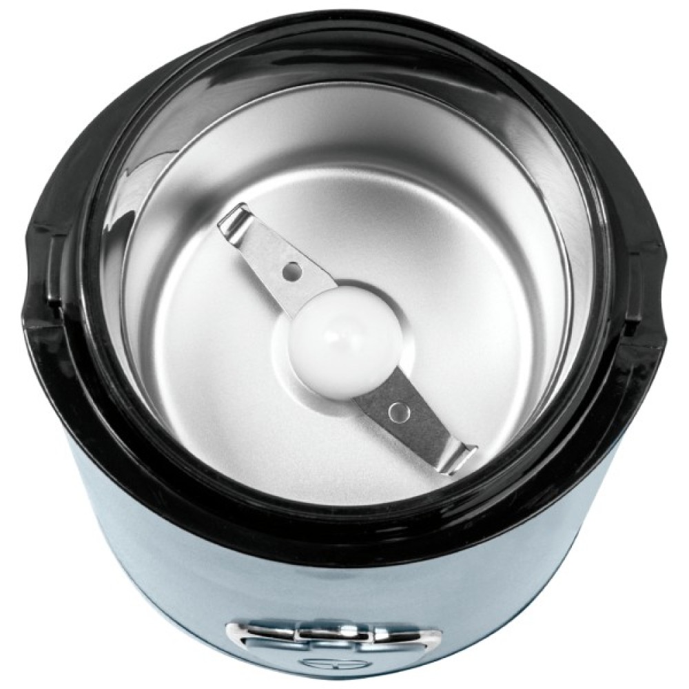 Потужність: 150 Вт; Місткість контейнера для зерен: 50 г; Імпульсний режим; Контейнер з нержавіючої сталі; Ударний ніж з нержавіючої сталі; Відсік для зберігання шнура; Блокування включення при знятій кришці; Розмір виробу: 9,0х18,2х10,3 см; Матеріал корпусу: пластик; Колір: блакитний.