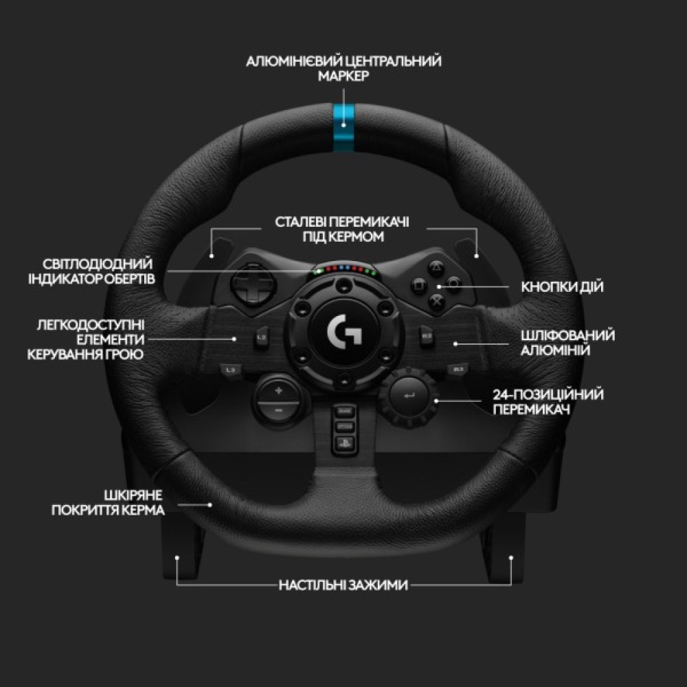 Вдосконалений класичний дизайн. Завдяки новій колірній гамі, першокласному шліфувати металу, автомобільному шкіряному покриттю і педалей з полірованої сталі ігровий кермо G923 не відрізнити від справжньої. Форма відповідає наповненню - оціните переваги вбудованого маркера центрального положення і дискового регулятора.