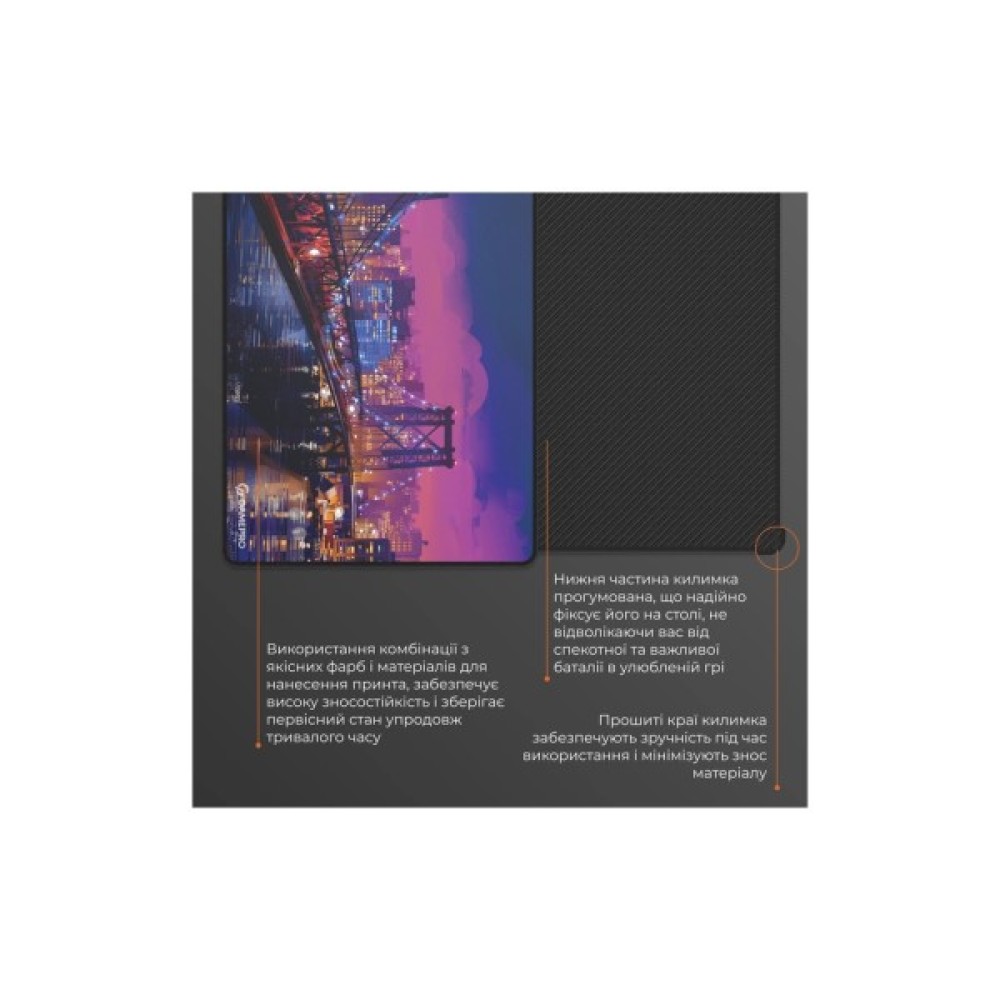 Прорезинена зворотна сторона килимка гарантує надійну фіксацію на столі, запобігаючи будь-якому небажаному ковзанню. Це дозволяє зосередитися на грі без відволікань і стабільно контролювати кожен рух вашої миші.