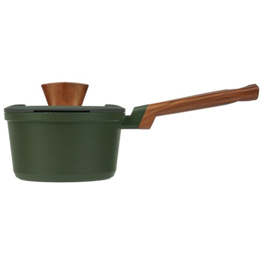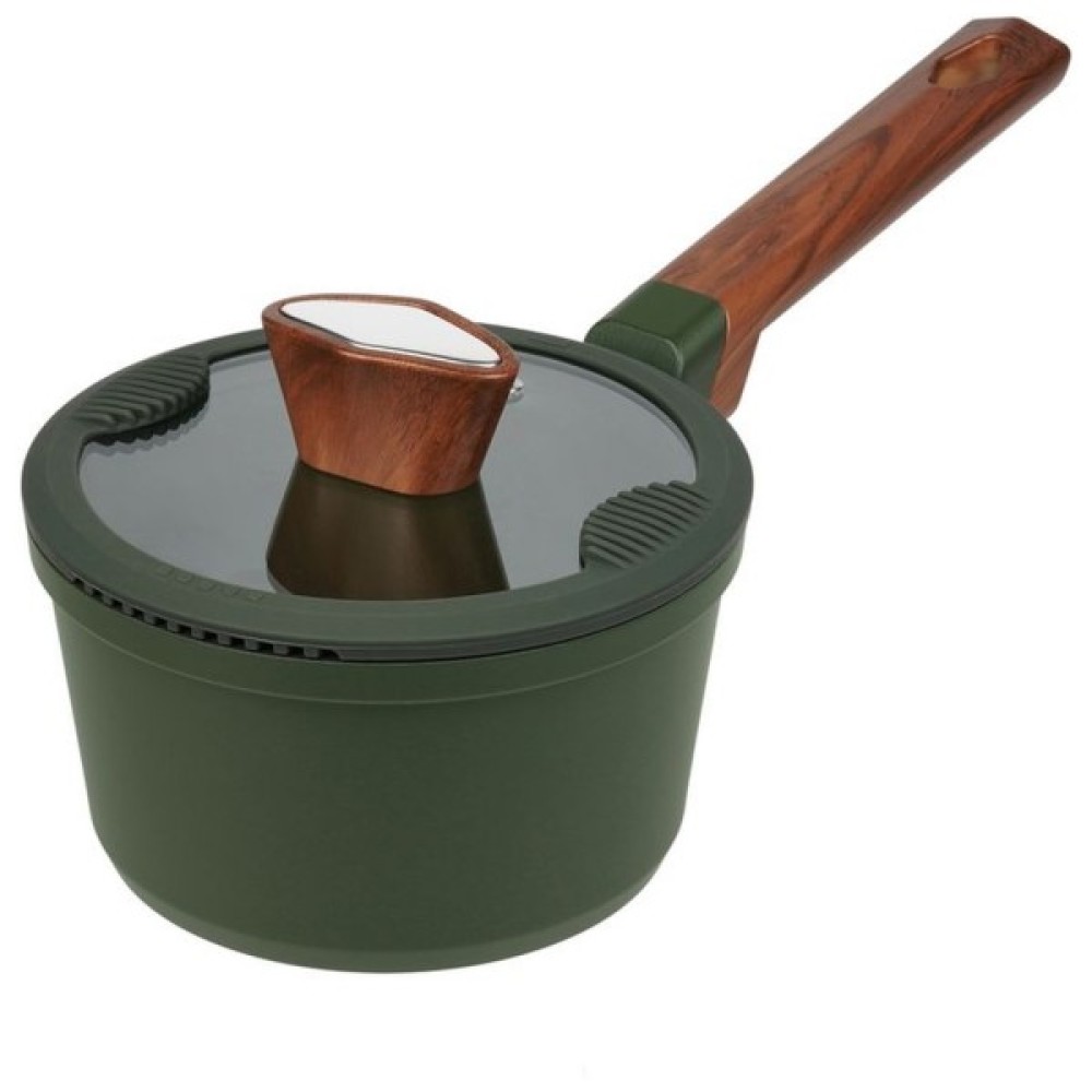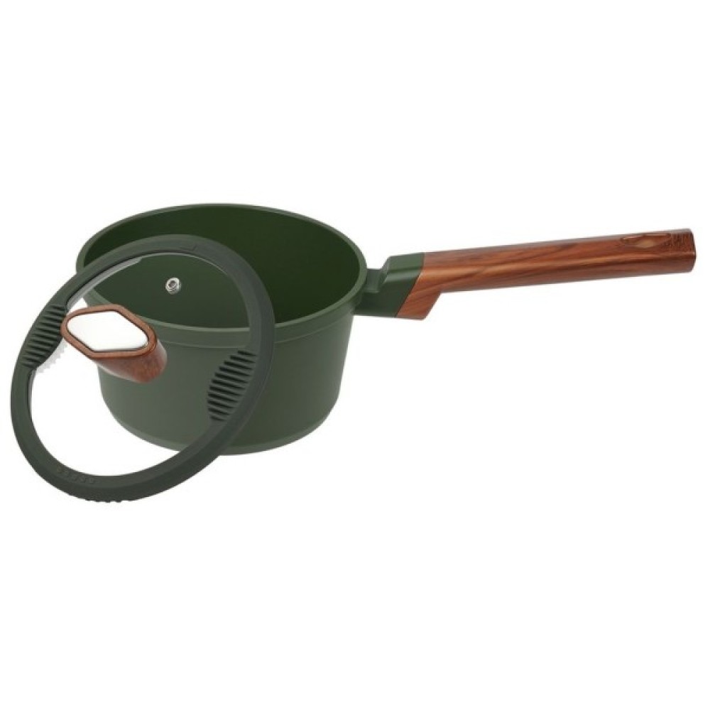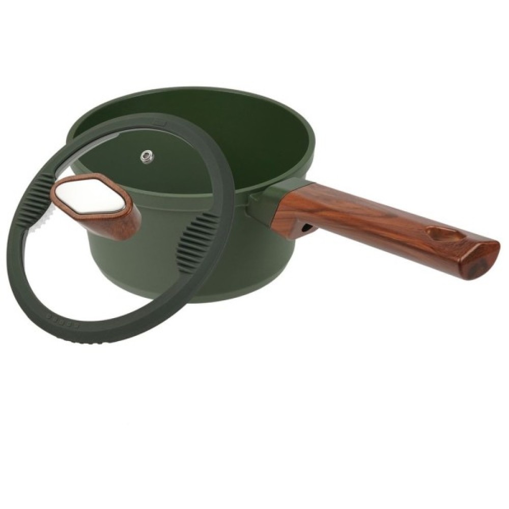 Для захисту від конденсату та запобігання розбризкуванню під час приготування їжі кришка з термостійкого скла оснащена стилізованою під дерево ручкою, силіконовим ободом та обладнана спеціальним отвором, що дозволяє легко випускати надмірну пару. Оскільки кухня – це зона підвищеного ризику, м'який силіконовий обід, що амортизує, захистить скло при падінні і не допустить деформації кришки. На обох сторонах кришки є отвори для зливу води, що замінюють друшляк і дозволяють зливати воду без зайвих зусиль. Також кришка має спеціальні силіконові вставки для захисту пальців при зливі води.