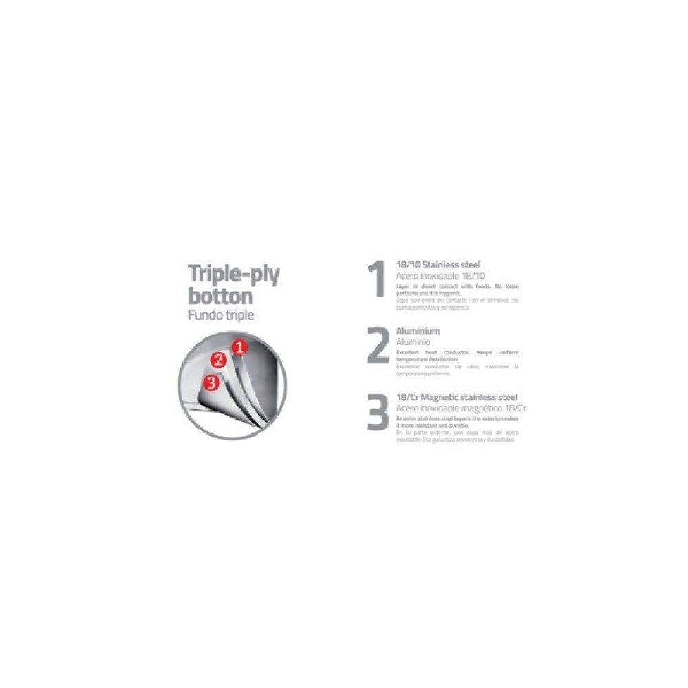 • Тришарове дно (нержавіюча сталь 18/10 - алюміній - нержавіюча сталь 18 / Cr), в результаті чого рівномірно розподіляє тепло, що забезпечує швидшу, рівномірну підготовку та економію енергії.