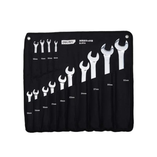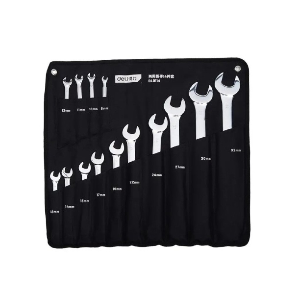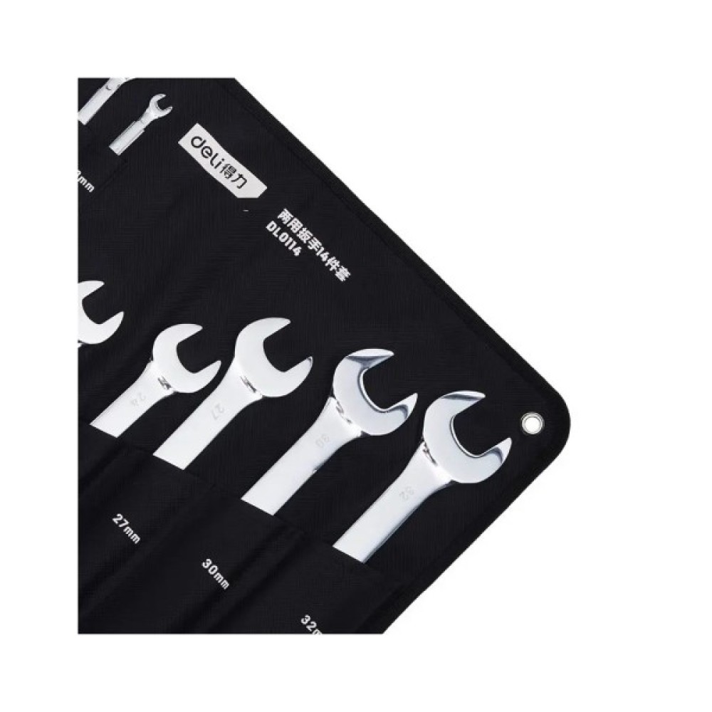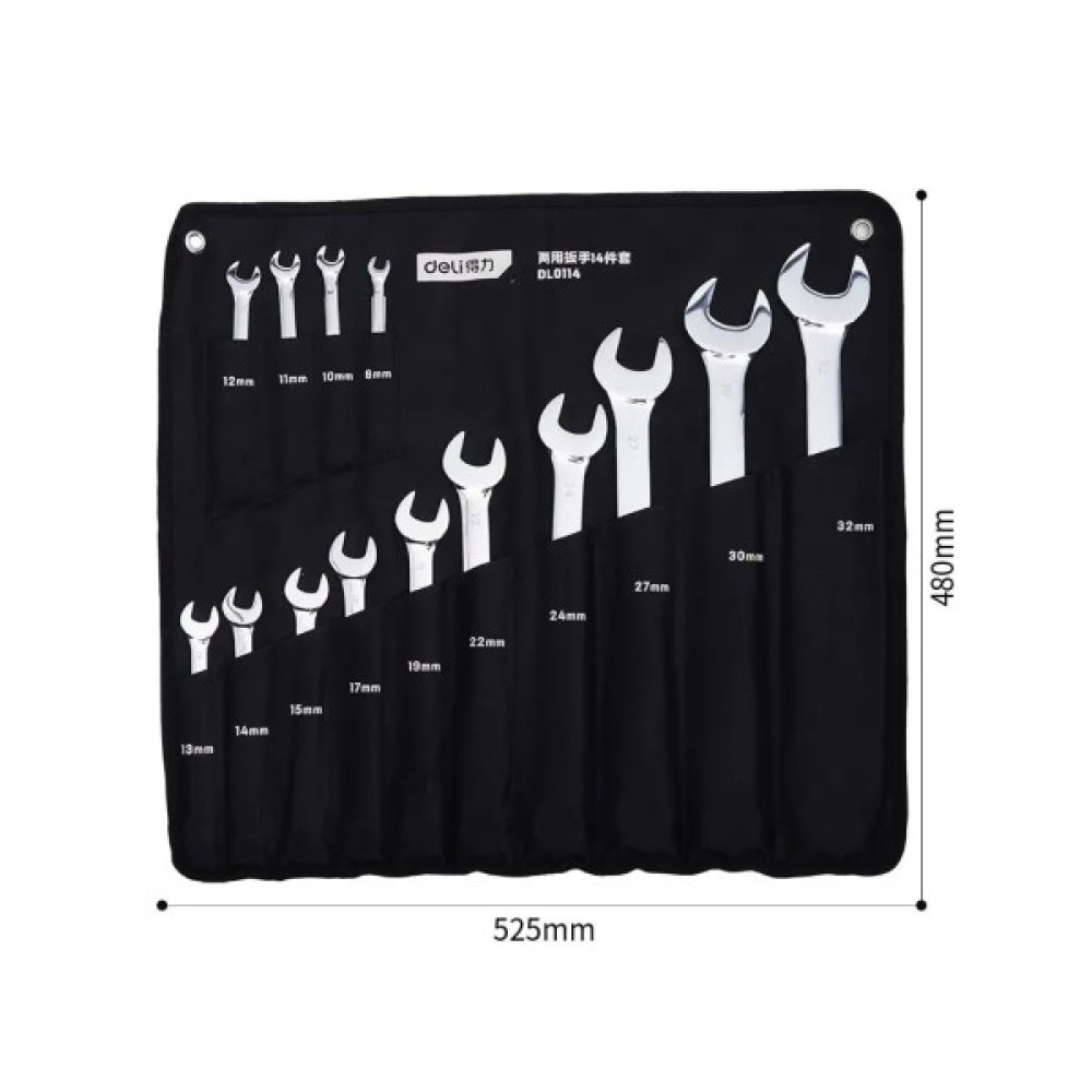 Набір комбінованих ключів Deli DL0114 містить 14 інструментів розміром від 8 до 32 мм, що дозволяє виконувати широкий спектр ремонтних і монтажних робіт. Ключі виготовлені з міцної Cr-V сталі, яка забезпечує високу зносостійкість, довговічність і стійкість до значних навантажень. Комбінована форма кожного ключа робить набір універсальним для побутового та професійного використання.