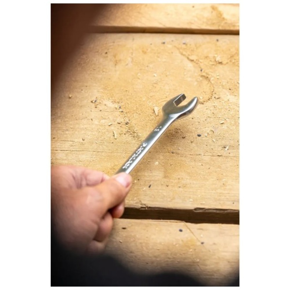 ✔ Обе головки рожкового ключа наклонены под углом 15 градусов к телу ключа для обеспечения оптимального доступа к крепежным элементам.