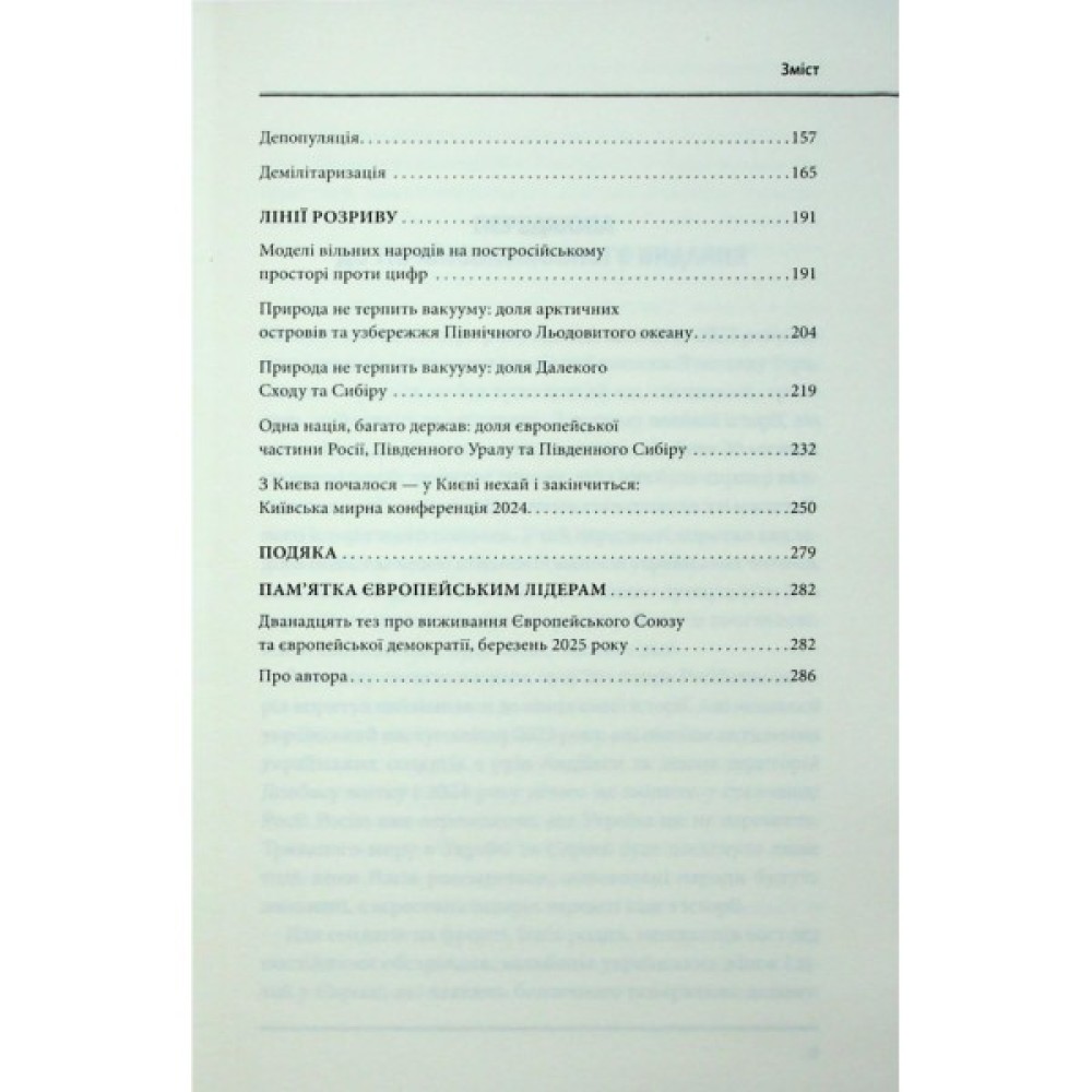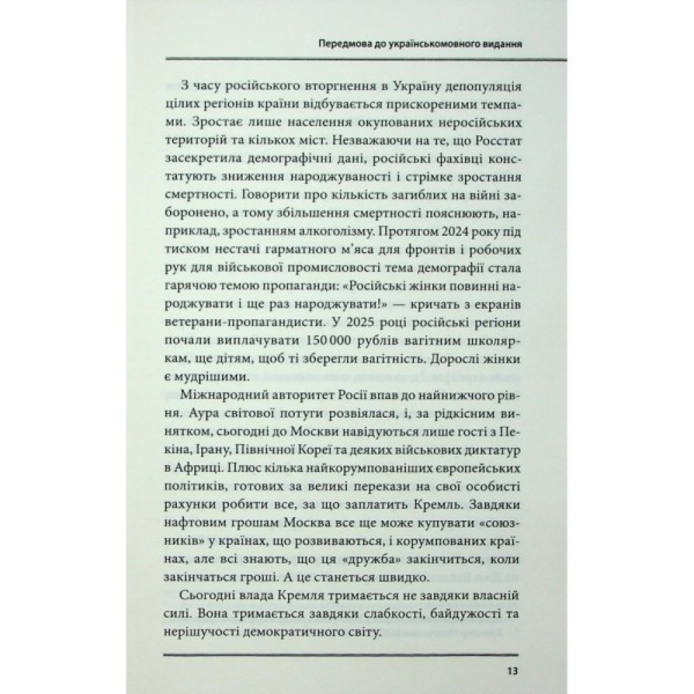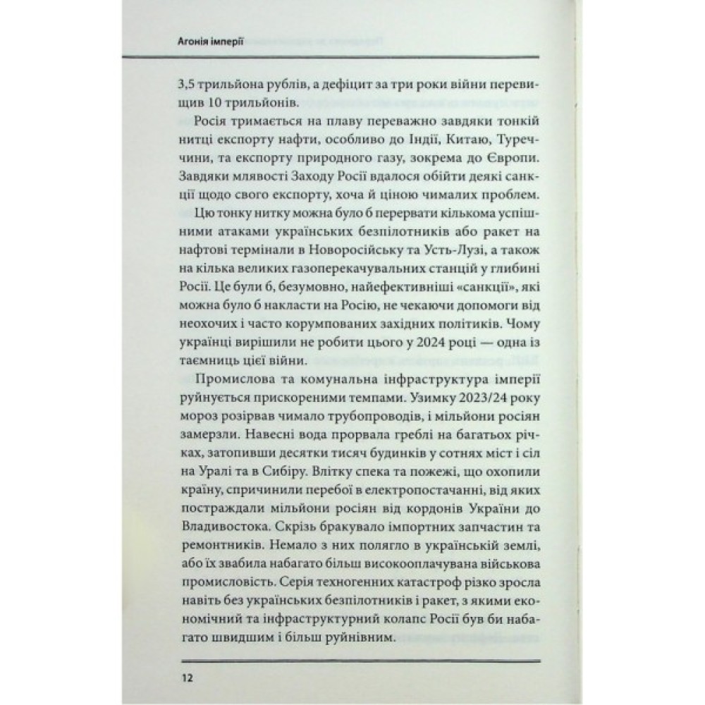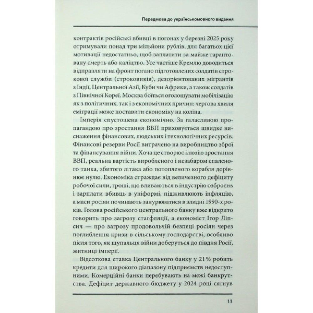 Автор аналізує глибокі системні проблеми, як-от економічна залежність від енергоресурсів, авторитарна політика та націоналістична ідеологія, які утримують Росію в її нинішньому стані. Месік проводить паралелі з падінням інших імперій і показує, як їхні внутрішні суперечності та зовнішні кризи призвели до руйнування. Експерт переконливо доводить, що Росія, попри військову та політичну потужність, є надзвичайно вразливою, і її розпад - це лише питання часу.