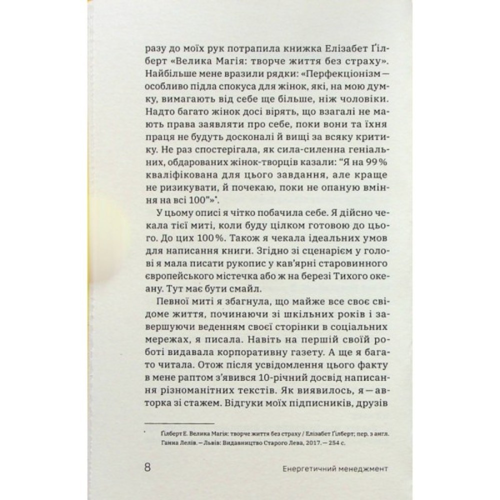 «Енергетичний менеджмент: практичний посібник з керування власною енергією» — це книга, яка допоможе ліпше зрозуміти, як з турботою ставитися до власної енергії. Це путівник, який покаже шлях до гармонійного використання власних ресурсів у різних сферах життя. Авторка пропонує практичні поради та інструменти, що допоможуть знизити рівень стресу, підвищити продуктивність та поліпшити якість свого життя. Вона зрозуміло й доступно пояснює, як правильно розподіляти свою енергію — від роботи до відпочинку, від стосунків з близькими до реалізації свого покликання.