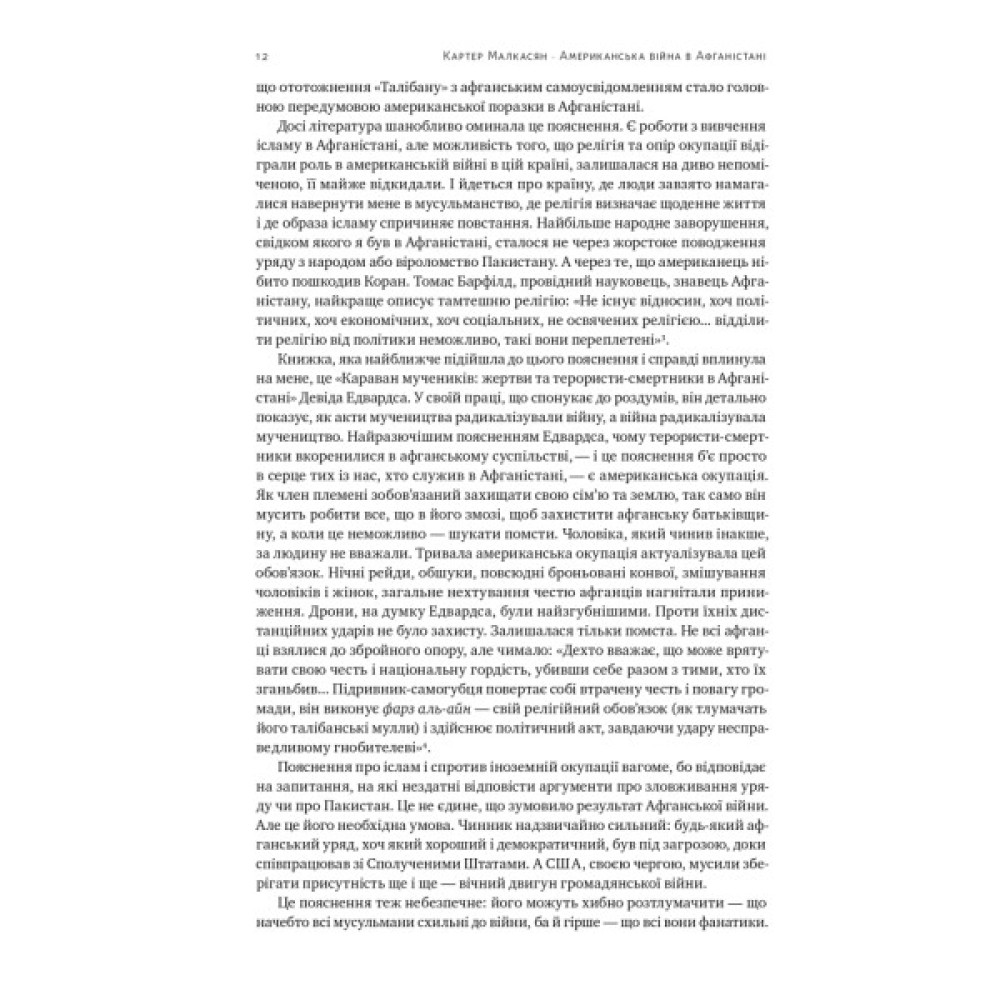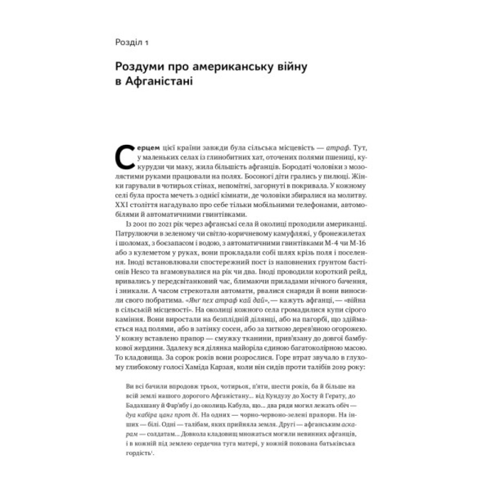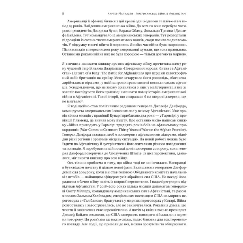 Американська війна в Афганістані, що тривала з 2001 по 2021 рік, стала найдовшим збройним конфліктом в історії США. Книжка військового аналітика Картера Малкасяна надає вичерпне розуміння всього конфлікту, розкриває політичну, економічну та соціальну складові війни.