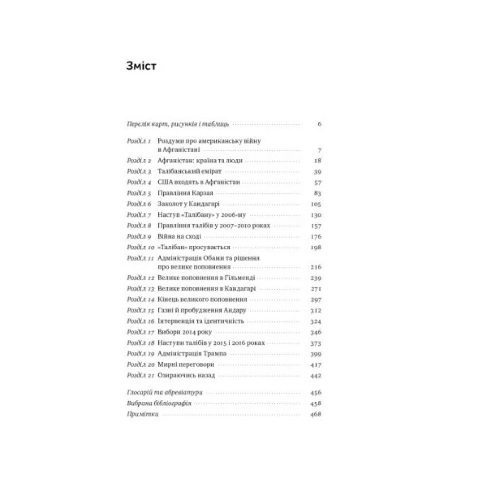 Спираючись на власний досвід, глибокі знання і багатий масив першоджерел, автор проходить через кілька етапів війни: вторгнення 2001 року; відродження талібів у 2006 році; «велике поповнення» епохи Обами; перезавантаження стратегії після 2011 року, наслідки ліквідації лідера «Аль-Каїди» Усами бен Ладена та вплив на війну «Ісламської Держави»; трагічна кульмінація поразки США після виходу з Афганістану у 2021 році та швидкого повернення «Талібану» до влади в країні.
