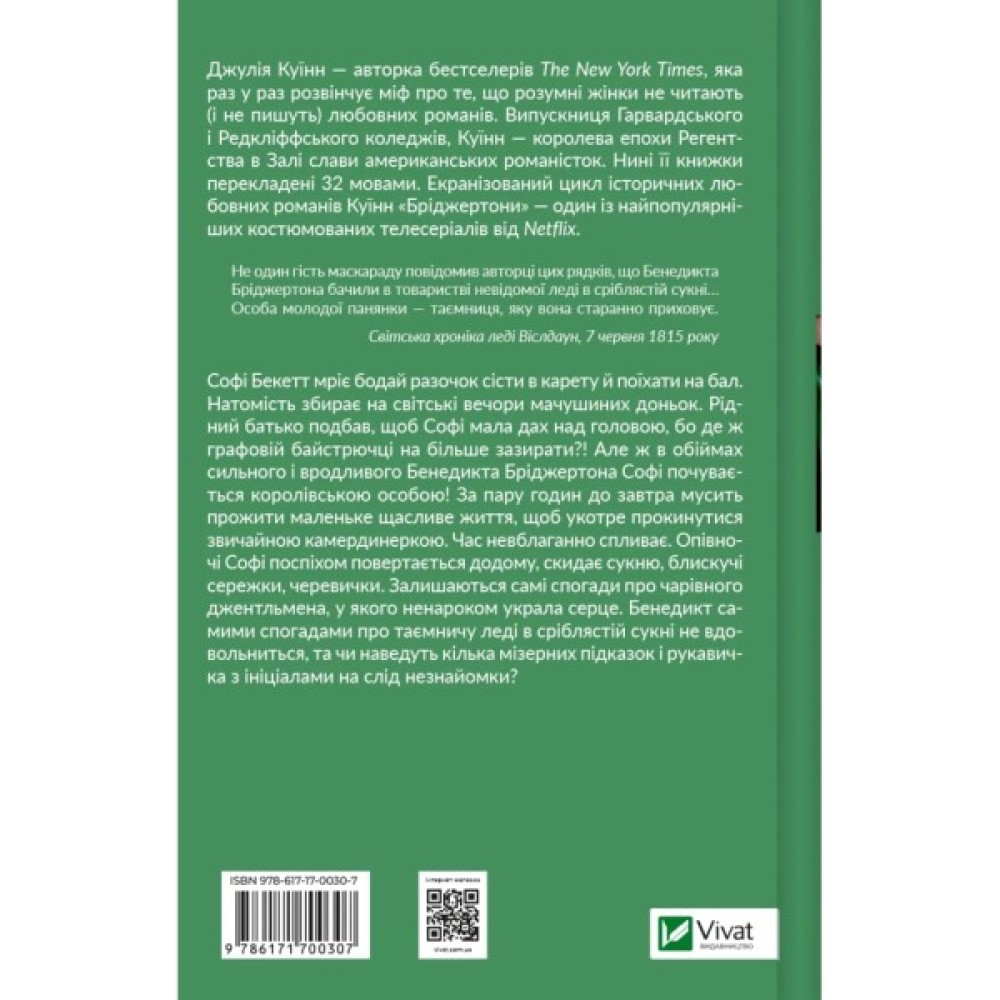 Книга «Бріджертони. Пропозиція джентльмена» — це продовження надзвичайно популярної серії американської письменниці Джулії Куїнн, що розповідає про життя молодшого покоління династії Бріджертонів. Сповнена пишнот епохи, інтриг і пліток, чуттєвості й пристрасті сага нарешті продовжується!