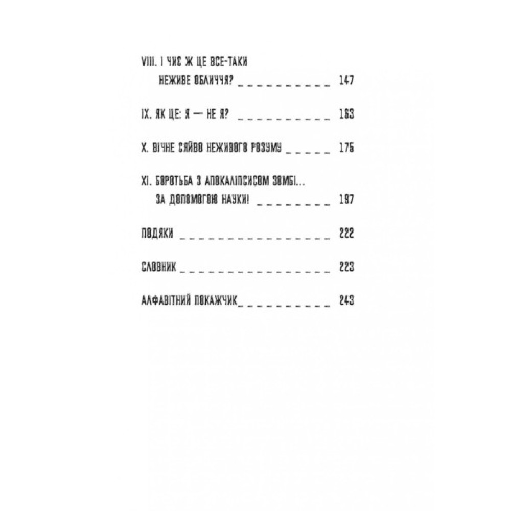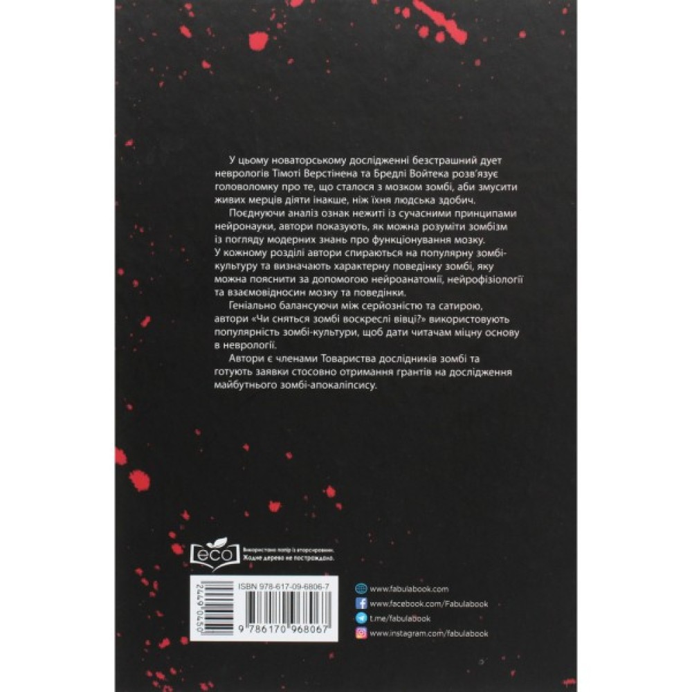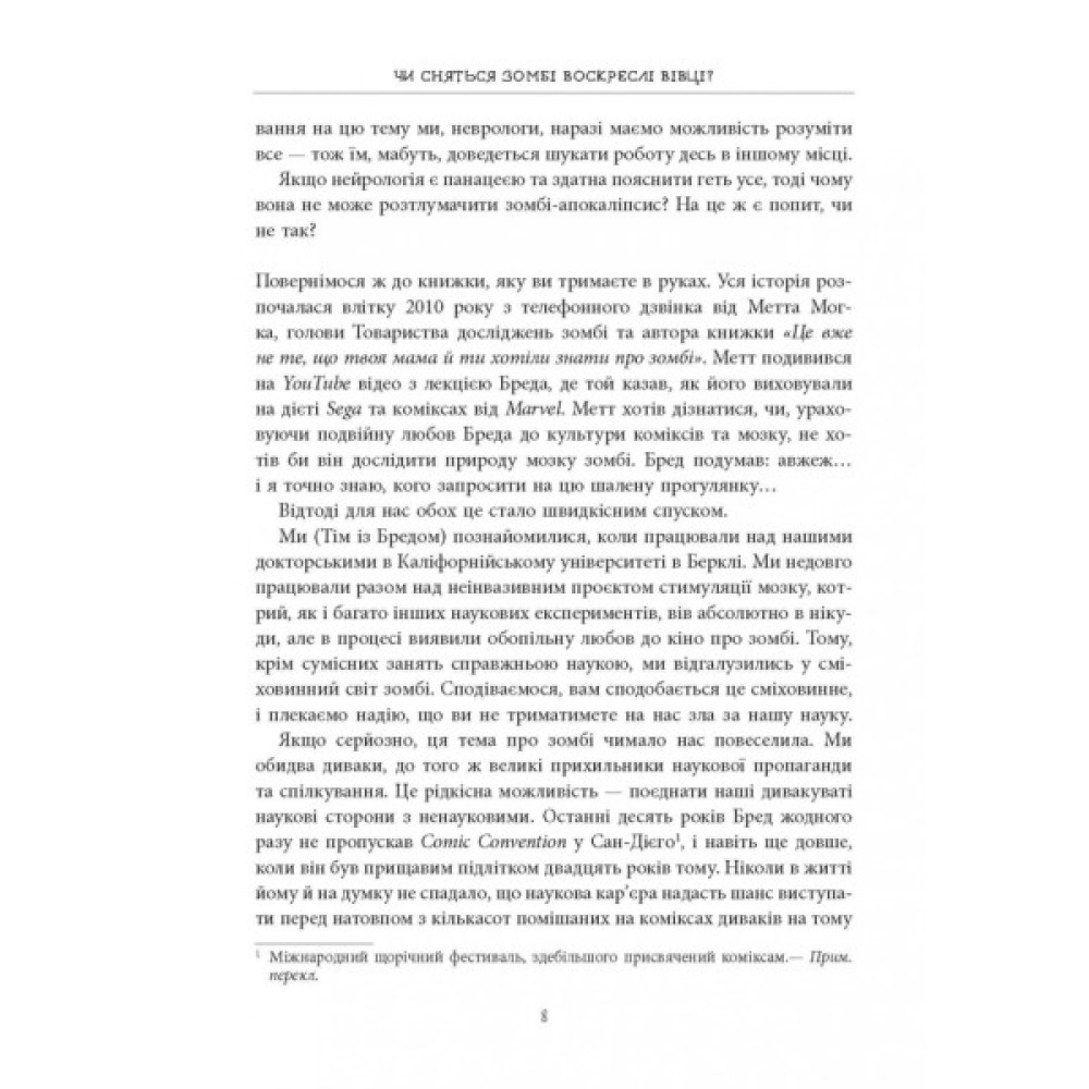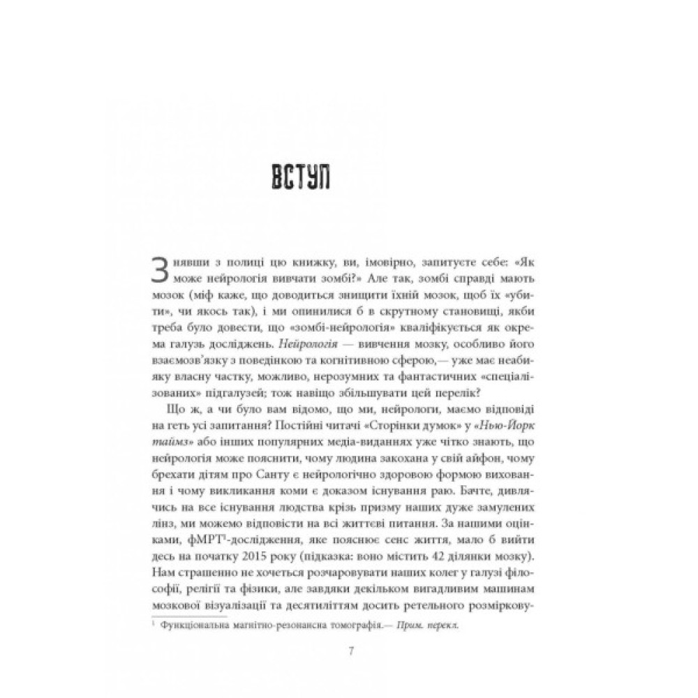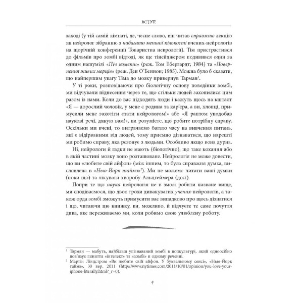 Як функціонує мозок під час сну та неспання? Які нейронні системи контролюють рух? Якою є природа чуттєвого сприйняття? Пролити світло на основні питання нейронауки нам допоможе дует відомих американських неврологів. Але дізнаєтеся ви про це в дуже незвичний спосіб — за допомогою зомбі. Кожен розділ спирається на популярну зомбі-культуру та визначає характерну поведінку зомбі, яку можна пояснити за допомогою нейроанатомії, нейрофізіології та взаємовідносин мозку та поведінки.