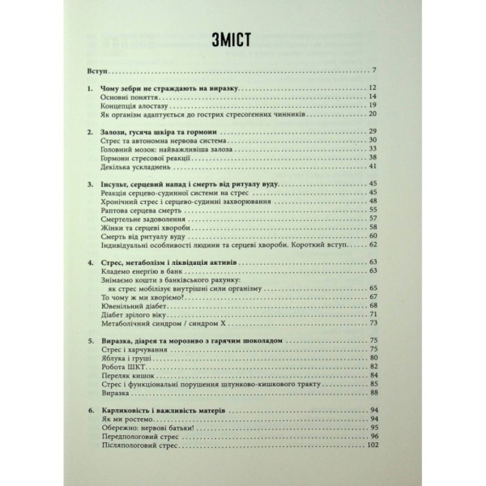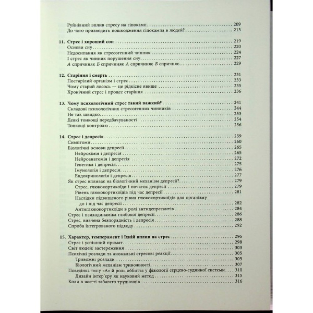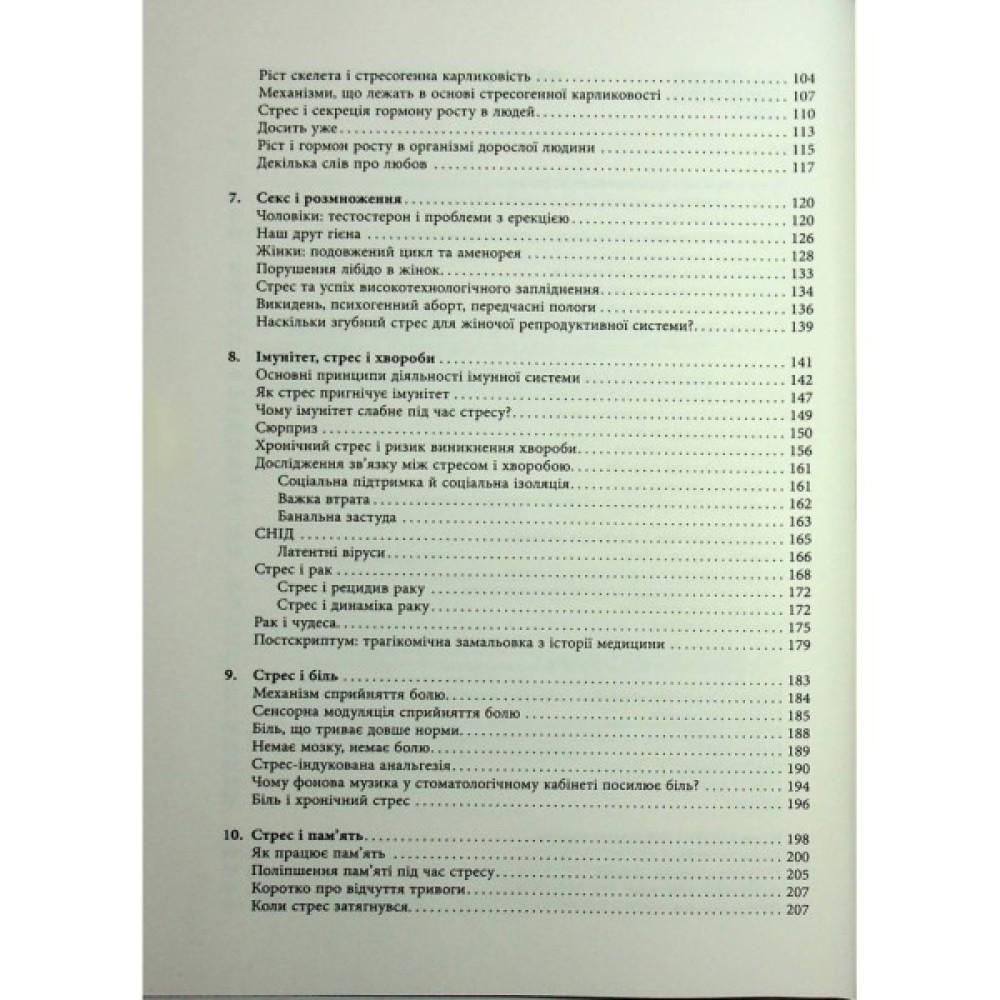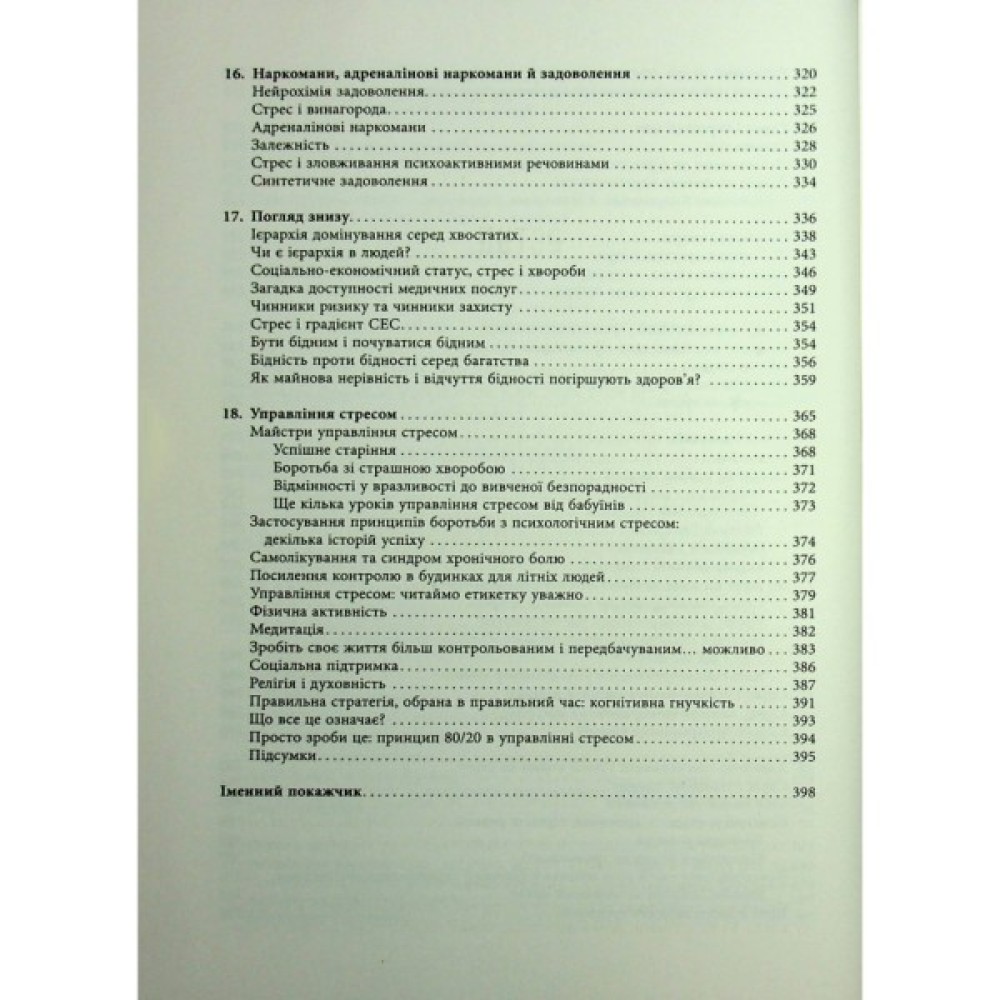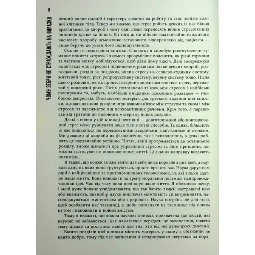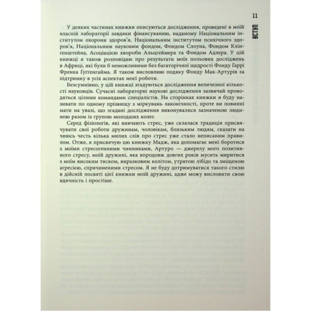 Усі хвороби — від стресу. Чули таке? Роберт Сапольські, професор біології та нейрології Стенфордського університету, вирішив це перевірити. У цій книжці зібрані результати багатьох досліджень, виконаних вченими з різних галузей. Стрес і реакція організму на нього залежить від безлічі чинників, наприклад, від того, що їла ваша мама під час вагітності. Серйозну тему авторові вдалося подати без зайвої академічності, а терміни з’являються лише там, де це конче необхідно. Це корисна книжка для тих, хто прагне краще розуміти себе і своє тіло, але не хоче витрачати час на боротьбу зі спеціальною літературою. Зрештою, легкий стиль пана Сапольські робить читання напрочуд приємним.
